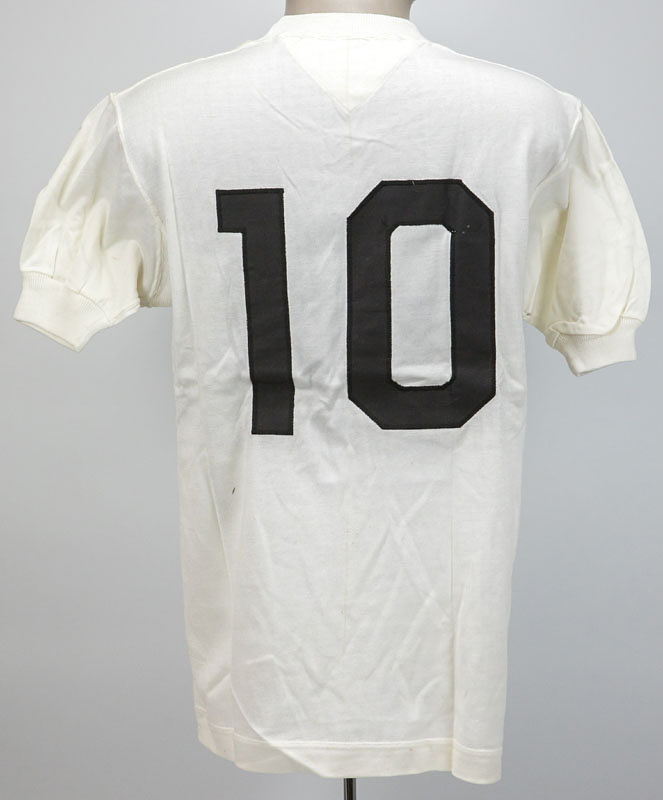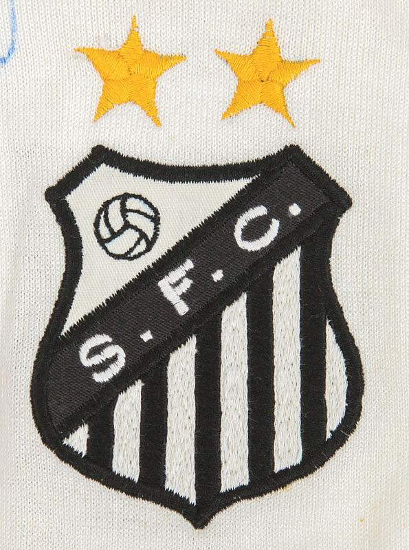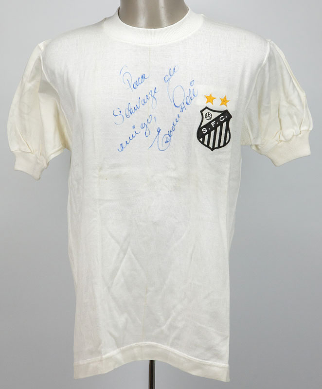Original match-issued jersey from FC Santos (Brazil) circa 1973/74, featuring Pele's number 10 on the back. With Pele's original dedication on the front. Unworn. Circa 1973/74. Status: ABA --Short-sleeved jersey; size approx. L; embroidered club logo and sewn-on linen back number; embroidered championship stars. Stretch cuffs, also underarm inserts. Athleta. Unusual back number, rarely used, e.g., in 1970. A very nice piece from one of the best and most popular players in football history. --From the collection of a journalist who knew Pele personally since 1957 and received this jersey with this dedication directly from his friend Pele around 1973. Condition: A-