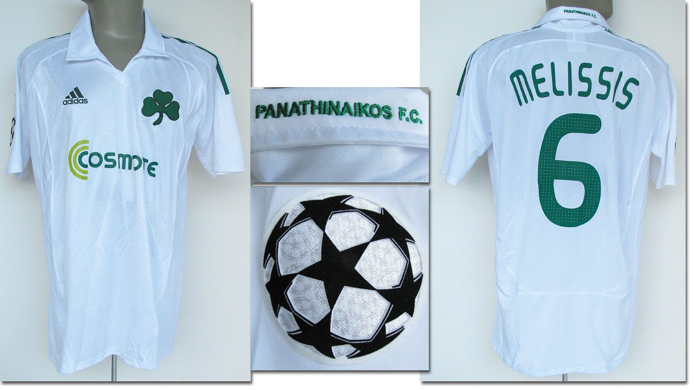 Original match-worn / issued shirt of Panathinaikos Athens (Greece) with the number 6. Worn by Chrostos Melissis in the 2008 Champions League season. Shirt directly from a former Werder Bremen kit manager. Status: AAB --Short-sleeved jersey; size L; sewn-on club emblem; embroidered adidas logo; rubberized 'Cosmote' advertising lettering; rubberized back number and player name; 'Panathinaikos F.C.' lettering embroidered on the back of the collar; with CL Starball patch; adidas. Condition: A
