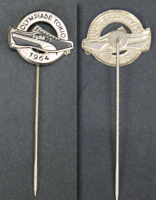 Olympic Games Tokyo 1964: Original advertising badge from the German sports shoe manufacturer Puma for the 1964 Tokyo Olympic Games, featuring the inscription "Olympiade Tokio 1964" and a black sports shoe with the inscription "Puma." Tinplate, black enamel, hollow stamping, 2.2 cm Condition: A