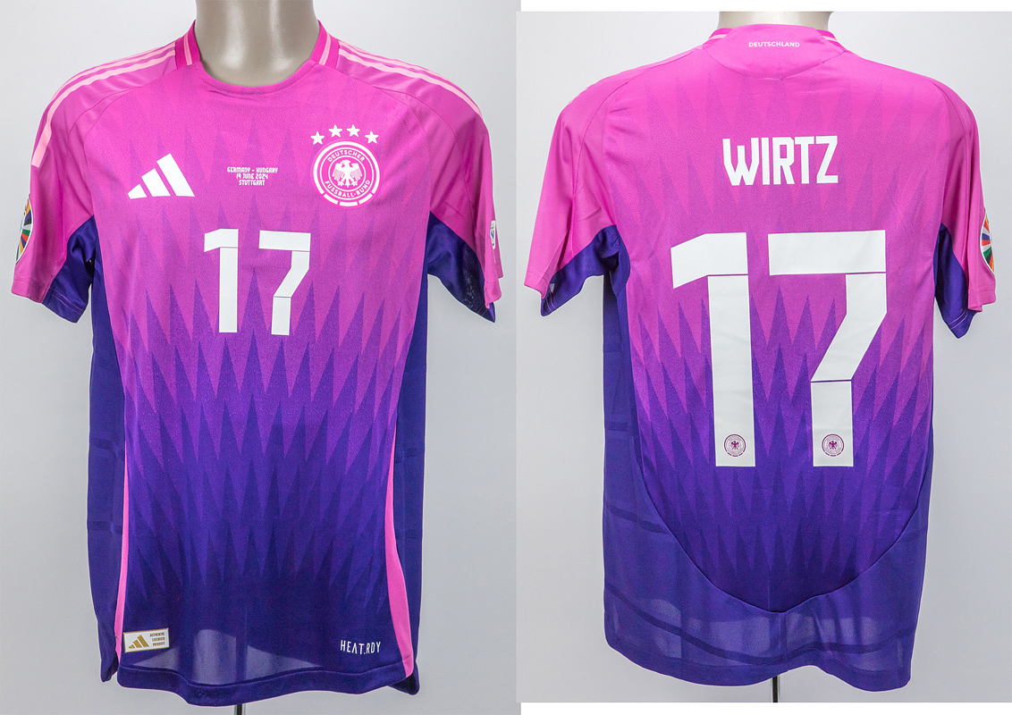 Original match-issued Germany shirt with number 17. Assisted by Florian Wirtz in a European Football Championship group match against Hungary on June 19, 2024. Germany won 2-0 in Hungary. Status: AAC --Short-sleeved jersey; size M; rubberized DFB logo, 4 World Cup stars and adidas logo; rubberized match details, player name and back number (front and back); rubberized 'Deutschland' lettering on the back of the collar; jersey with UEFA Euro 2024 Trophy patch and UEFA Foundation for children patch; adidas Heat.Rdy. Condition: A