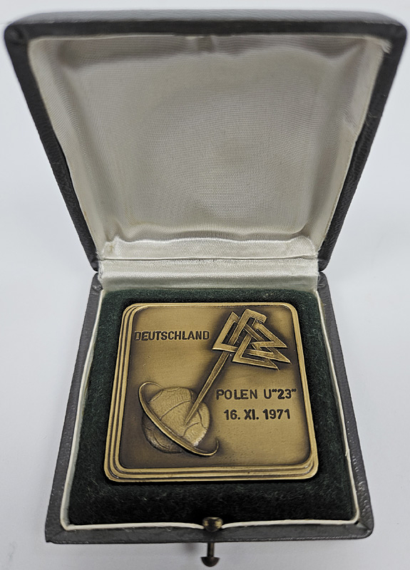 Official DFB international match medal for Werner Weist for his performance in the DFB U-23 international match between Germany and Poland on November 16, 1971, in Bremen. Bronze, 4.7 x 4.7 cm. In original case. The medal comes directly from the Werner Weist Collection (1949-2019) - Borussia Dortmund 1968-1971 (72/34), Werder Bremen 1971-1977 (145/33), Stuttgarter Kickers (1977-1978; 10/1); 3x DFB U-23 1970 + 1971). The buyer receives a certificate of authenticity and confirmation from the Weist family regarding the origin of the pieces. Condition: A