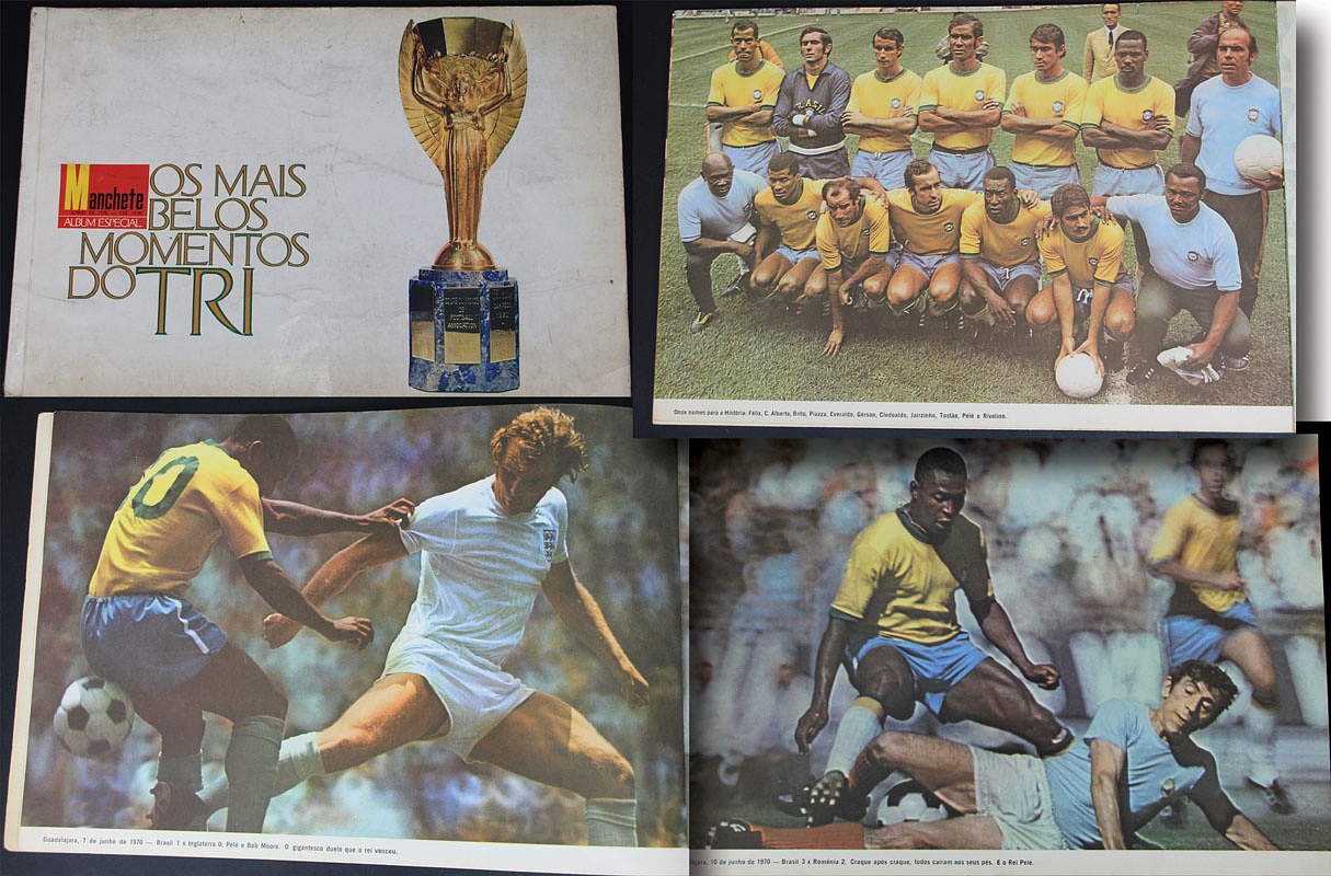 World Cup 1970: Large Brazilian book issued by the „Manchete“ newspaper celebrating Brazil's winning the World Cup in Mexico. 34 large full page colour photos (52x35) of the Brazilian players. Extremely rare. Cover creased and wavy. (Potuguese). Condition: C-