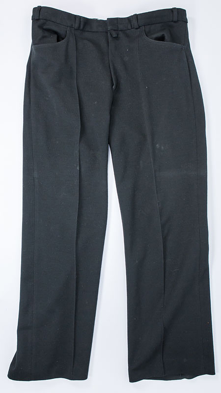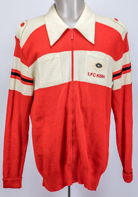- 1) 1. FC Köln leisure jacket by Heinz Simmet for the Bundesliga team players, circa 1968. New wool, red and white; with flocked "1. FC Köln" lettering on the chest pocket. Size 56. Manufacturer: "Carlo Gruber," Gruber logo sewn on the chest pocket. Red zipper; buttoned shoulder straps with red buttons. Museum piece! 2) Official black 1. FC Köln suit trousers by Heinz Simmet, made by adidas. 70% polyacrylic - 30% new wool. Size 50. Manufacturer: Schwahn/adidas. Status: ACC --The jacket was probably too large for Heinz Simmet (1944-2024; played for Cologne from 1967 to 1978), as he was only 1.73 m tall. It has some moth holes. He probably wore the trousers during the celebrations for the 1968 DFB Cup victory; the matching jacket is unfortunately missing. The Schwahn company manufactured tracksuit jackets, leisure jackets, and suits for addias until 1974. Both pieces come from an FC Cologne collection; the consignor received these items directly from Heinz Simmet. Condition: B
