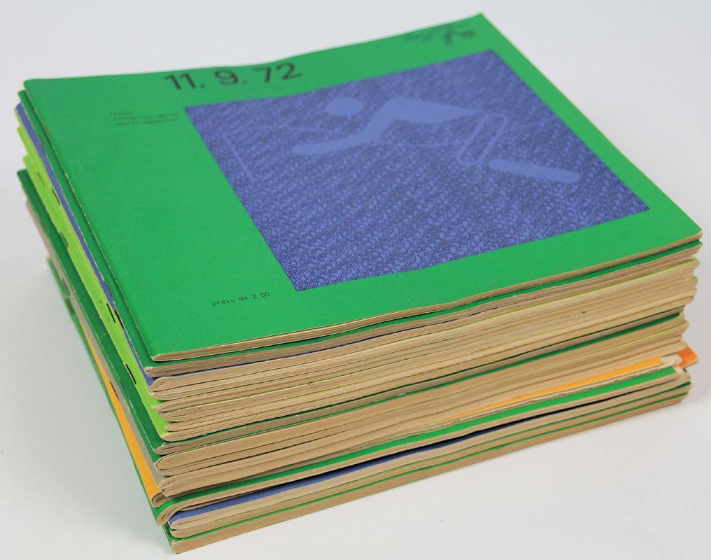 - 18 different daily programs for the 1972 Munich Olympic Games: Boxing (September 6), Rowing (August 29), Equestrian events (August 30, September 3, September 6 (with the original blacked-out "6" – the competitions on this day were canceled due to the attack on September 5 and were later rescheduled. A rarity!; September 11)), Modern Pentathlon (August 27); Athletics events (August 31, September 2, 2x September 4, 7, 9), Cycling (September 3); Gymnastics (September 1); Swimming events (2x September + 3). Approximately 700 pages, 21x10.5 cm.. Also included is shooting (31.8. - back cover missing). Great collection, a nice cross-section of sports. --With results entries Condition: C