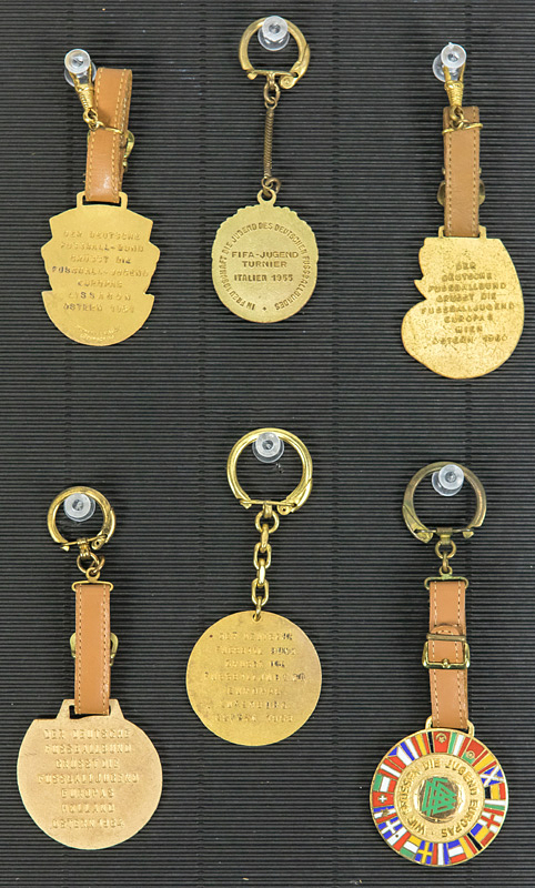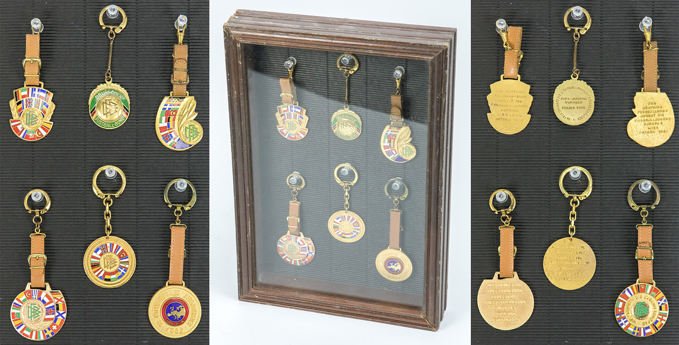 6 Participation Pins UEFA Tournament 1955 - 1965 - 6 participant badges from FIFA / UEFA youth tournaments of the DFB delegation: Italy 1955, Luxembourg 1958, Austria 1960, Portugal 1961, Holland 1964, BR Germany 1965. Bronze, gold-plated, multi-colored enameled, 4.5x4.5 cm to 4x3.5 cm . With leather straps or chain. In a specially made display case with wall hanging --All badges are in very good condition. These are the official DFB participant badges for this tournament. The frame of the showcase is made of wood. The back panel is removable. glass pane. 32x22x4cm. Very decorative exhibit Condition: A-