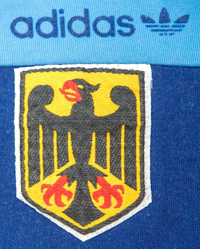 - Adidas tracksuit jacket with the emblem of the German national team, circa 1984. Size: 7. 52% cotton, 48% polyamide. Adidas lettering and emblem flocked on. Team badge embroidered and sewn on. Adidas, Made in Yugoslavia. Zipper is functional. Condition: B