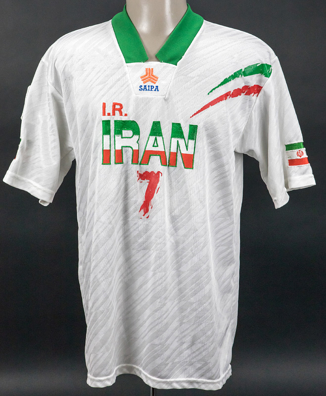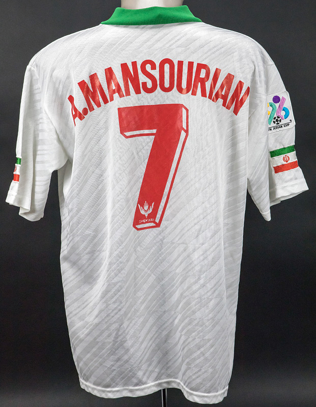 Asian Cup 1996 match worn football shirt Iran - Original match-worn Iran shirt with the number 7. Worn by Ali Reza Mansouriani on November 21, 1996, in the Asian Cup third-place match against Kuwait. Iran - Kuwait 3:2 on penalties. Status: AAB --Short-sleeved jersey; size approx. L; embroidered association logo and Saipa logo; rubberized player name and number (front and back); jersey shows signs of wear (rubber on the Iranian flag and front player number is partially loose and missing); with Emirates 96 XITH Asian Cup patch and two Iranian flag patches; Saipa. Jersey comes from the collection of a former Bundesliga player. Condition: A-