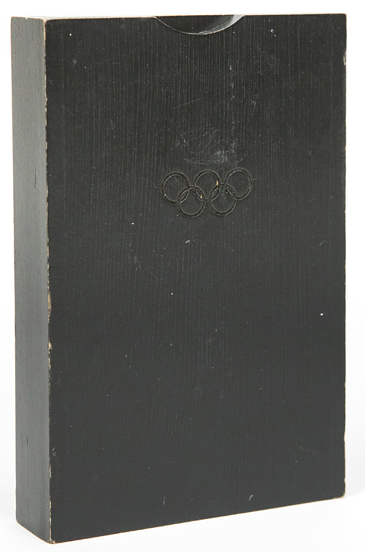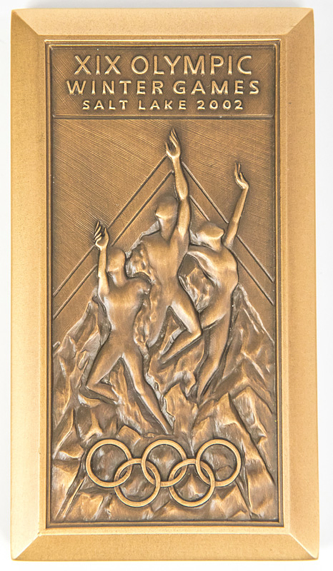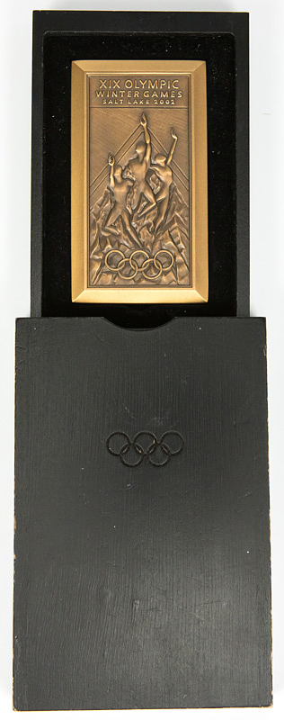 Athlets Participation Medal Olympic Games 2002 - Official participation medal for athletes of the 19th Olympic Winter Games of Salt Lake City 2002. Bronze (weight: 242 g), 9x5 cm. In original black wooden box. (13.5x9x2.5 cm). This medal was only given to athletes for their participation in the 2002 Winter Olympics. The original wooden box is rare. Coaches, journalists and volunteers received a different medal which is was smaller and lighter. Condition: A
