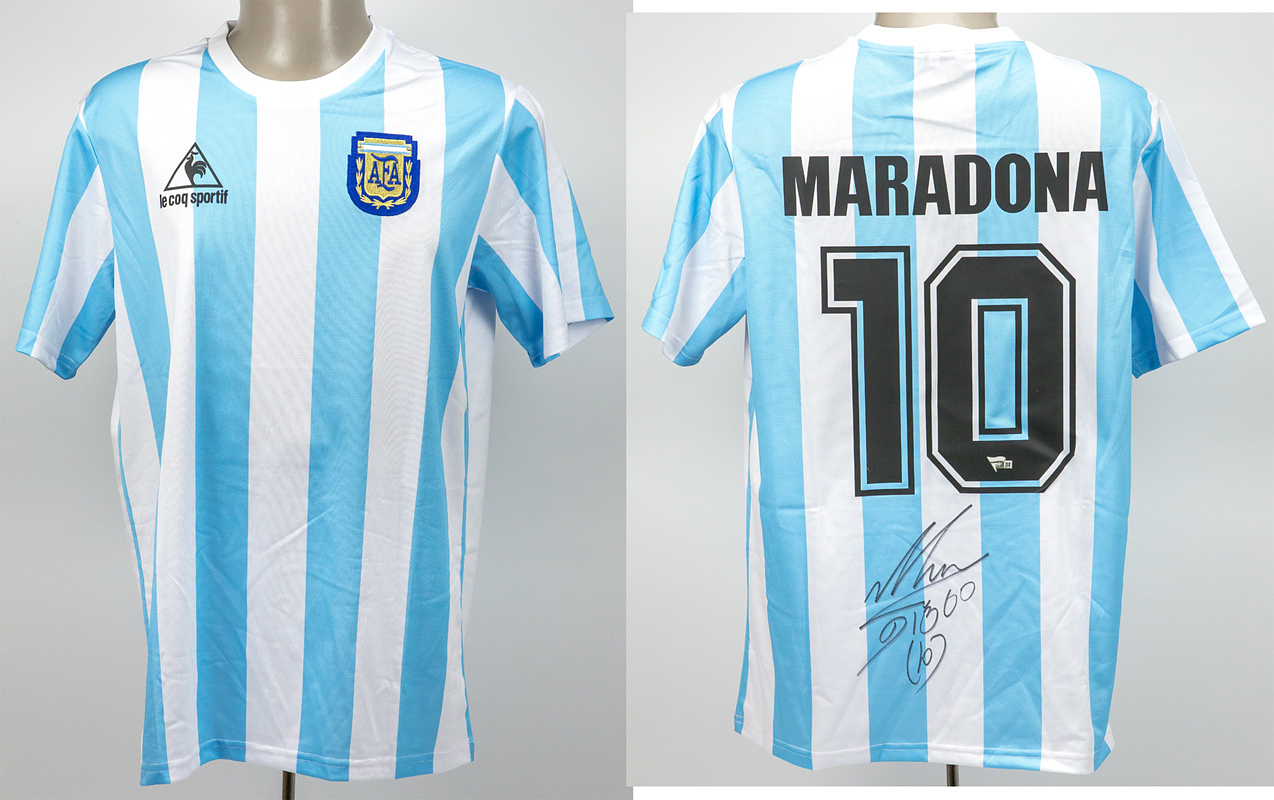 - Beautiful retro jersey of the Argentinian national team from the 1986 FIFA World Cup, number 10. Manufacturer: Le Coqsportif, circa 2005. With Diego Maradona's original signature on the back! With Certificate of Authenticity from "Fanatics".. Size: L Condition: A