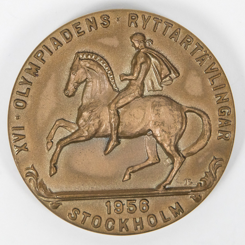 - Bronze medal from the 1956 Summer Olympic Games / Equestrian Games in Stockholm for third place. With edge stamp "Lagerströms - Mjolby" Bronze, 5 cm. --Only 12 bronze medals were awarded! --Melbourne, Australia, had been awarded the 1956 Olympic Games at the 1949 IOC Congress. This raised the question of how the equestrian competitions would be held. Australian Quarantine Law stipulated strict quarantine conditions, which would have meant a six-month quarantine for the horses… It wasn't until 1953 that the decision was made not to change the quarantine regulations and the equestrian competitions were canceled. Finally, in May 1954, the IOC reassigned the 1956 equestrian events separately from the other Olympic competitions, and Stockholm was awarded the venue. 164 athletes from 29 countries participated in the equestrian games. (wiki) Condition: A