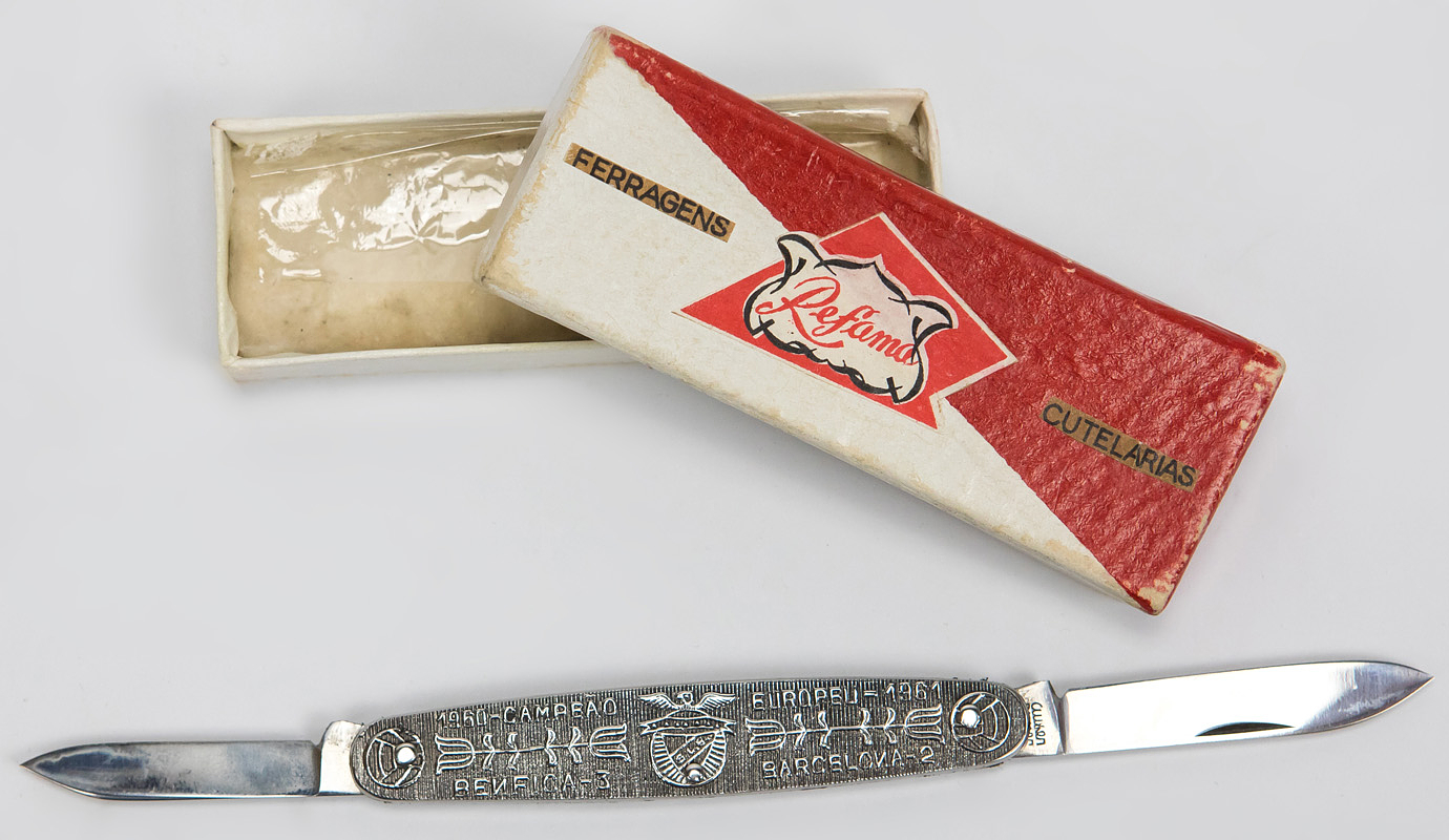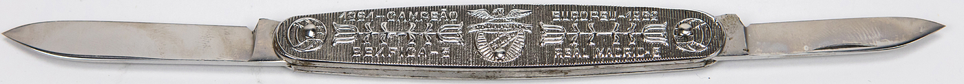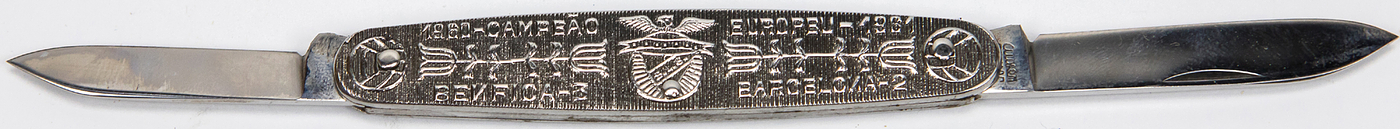 - Chrome-plated pocket knife commemorating Benfica Lisbon's two European Cup triumphs. Both sides of the knife bear inscriptions and the Benfica club logo: "1961/1962 Campeao Europeu Benfica - Real Madrid 5-3" 2) "1960/1961 Capeao Europeu Benfica - Barcelona 3-2". 8.5 x 1.8 cm. In original cardboard box -- -Guttmann Estate 2001 No. 261 Condition: A