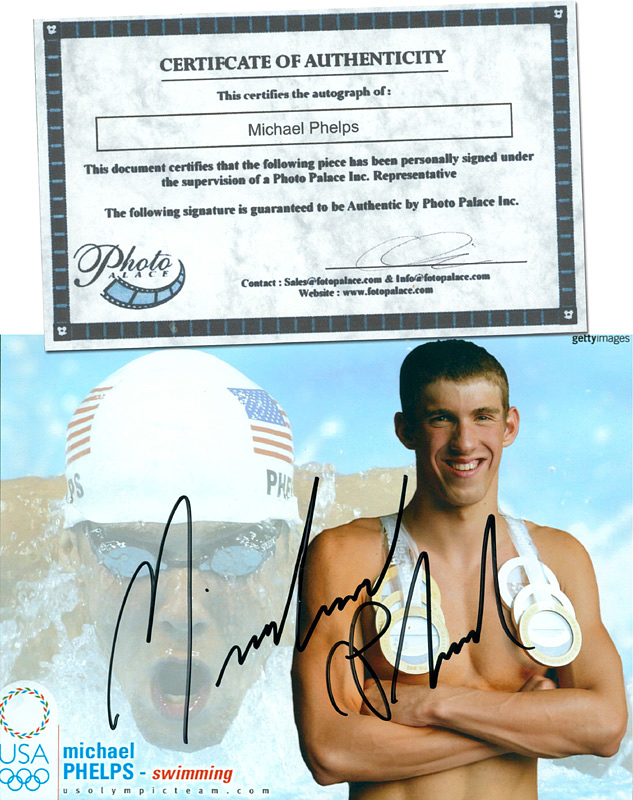 - Color photograph with original signature of Michael Phelps (USA). Sports superstar. He is considered the most versatile swimmer of our time and, with 28 Olympic medals, including 23 golds, is by far the most successful Olympian in history. Autographs are rare! 20x15 cm. With certificate of authenticity from "Photo Palace". Condition: A