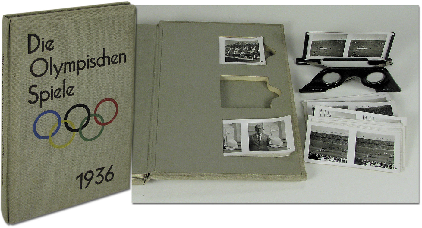 - Die Olympischen Spiele 1936. 100 spatial Photographs by Heinrich Hoffmann. Sptial view album with 60 pages of descriptive text. Original four-colour linen case with original glasses. Viewing the pictures through the enclosed glasses gives a three-dimensional effect. Binding loosened, otherwise good copy! With 100 b/w 3D pictures (complete) and the original viewing glasses. In original cloth bound album with 60 pageswith text. Size 21x30cm. Binding loose, otherwise good copy! Condition: C+