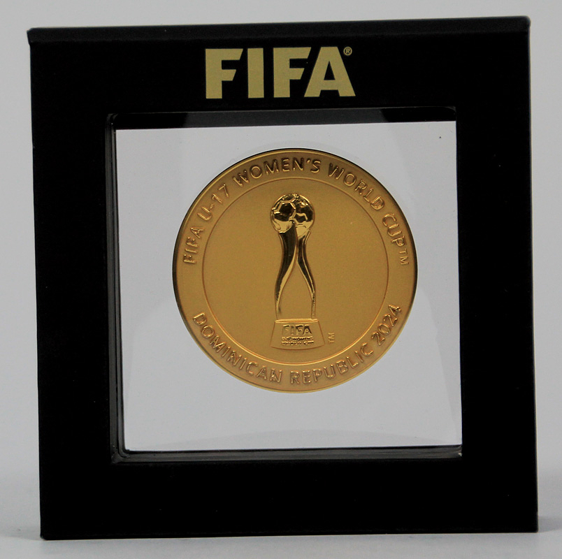 - "FIFA U-17 Women's World Cup Dominican Republic 2024" Official participant medal for coaches, officials, and players who took part in the 2024 FIFA Women's World Cup. Bronze, gold-plated. 5.0 cm. In original case. Condition: A