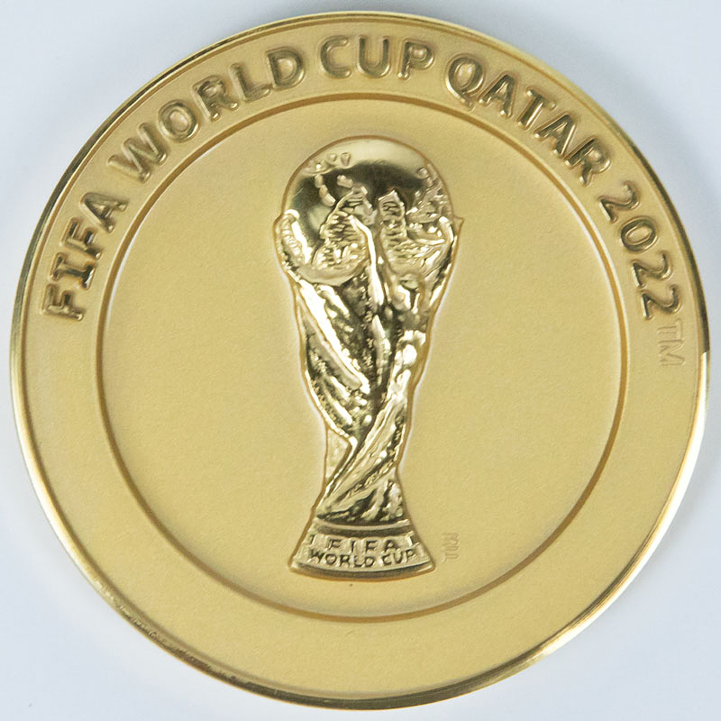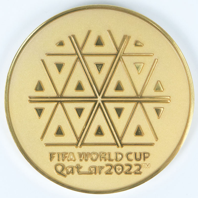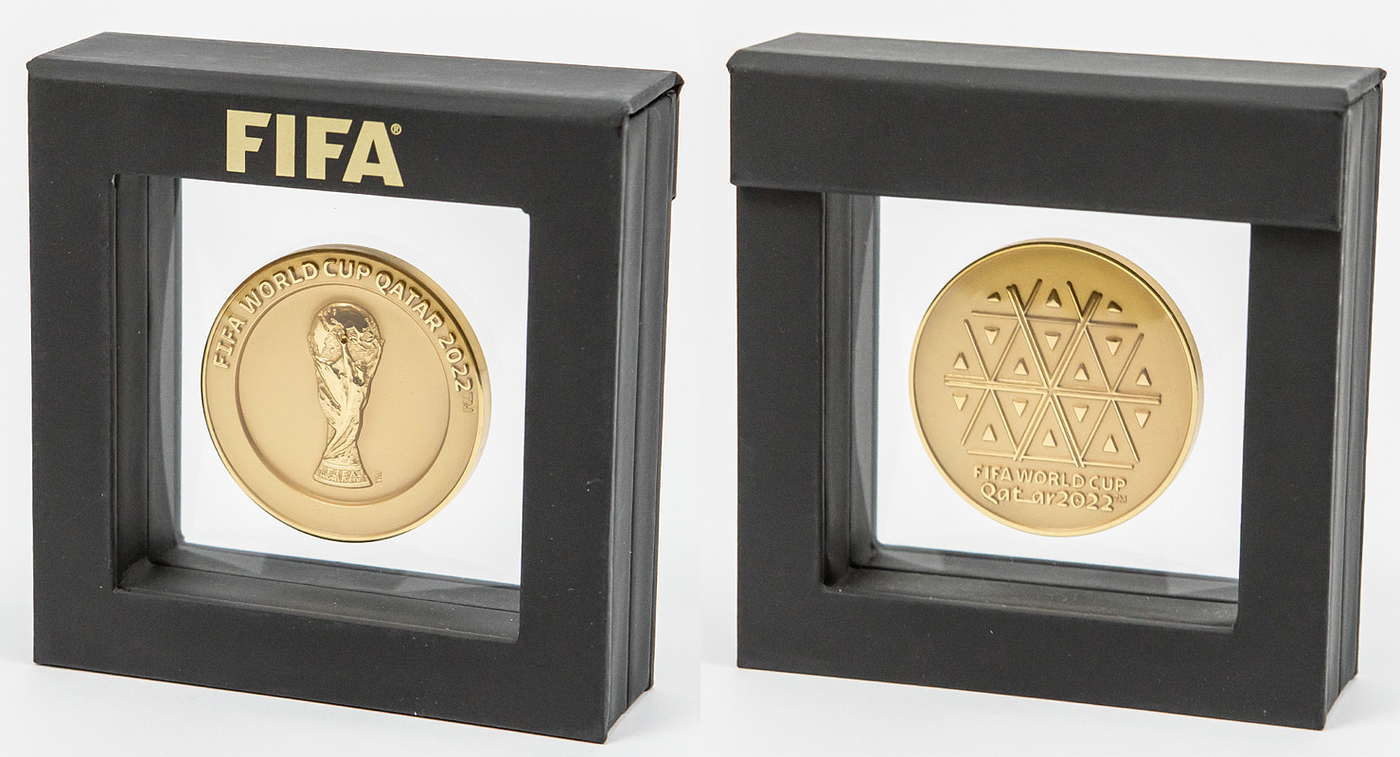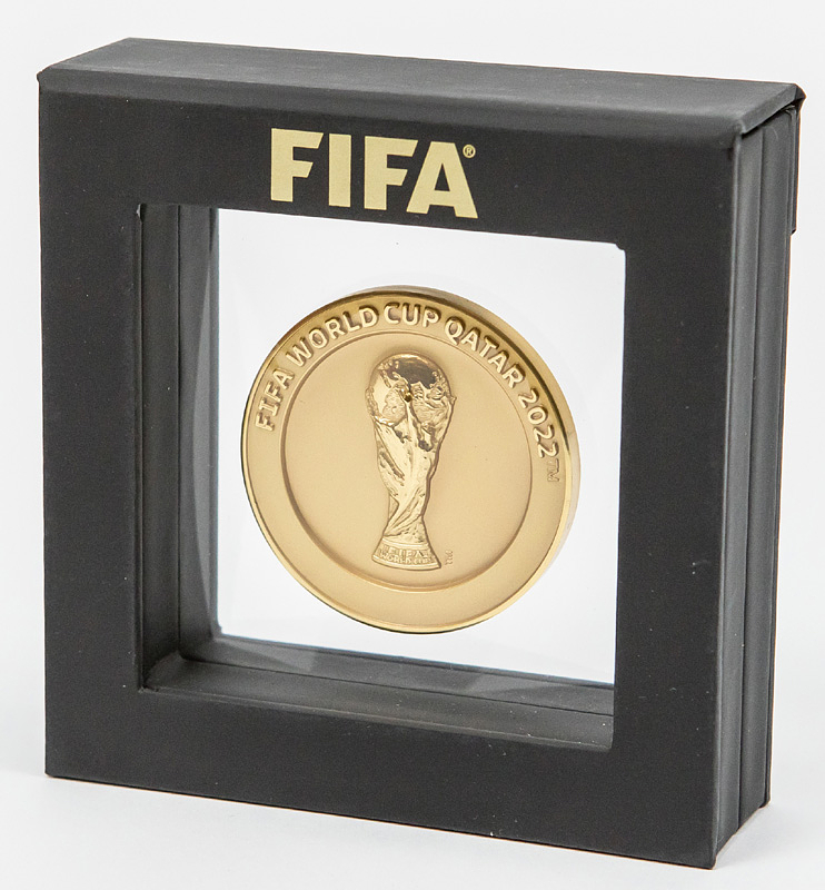 - „FIFA World Cup Quatar 2022“. Official participation medal for the Football World Championship. Bronze, gilded, size 5 cm. In original case with inscription "FIFA". Very rare, very beautiful! --Was awarded to the players, coaches and officials of the World Cup 2022. Condition: A