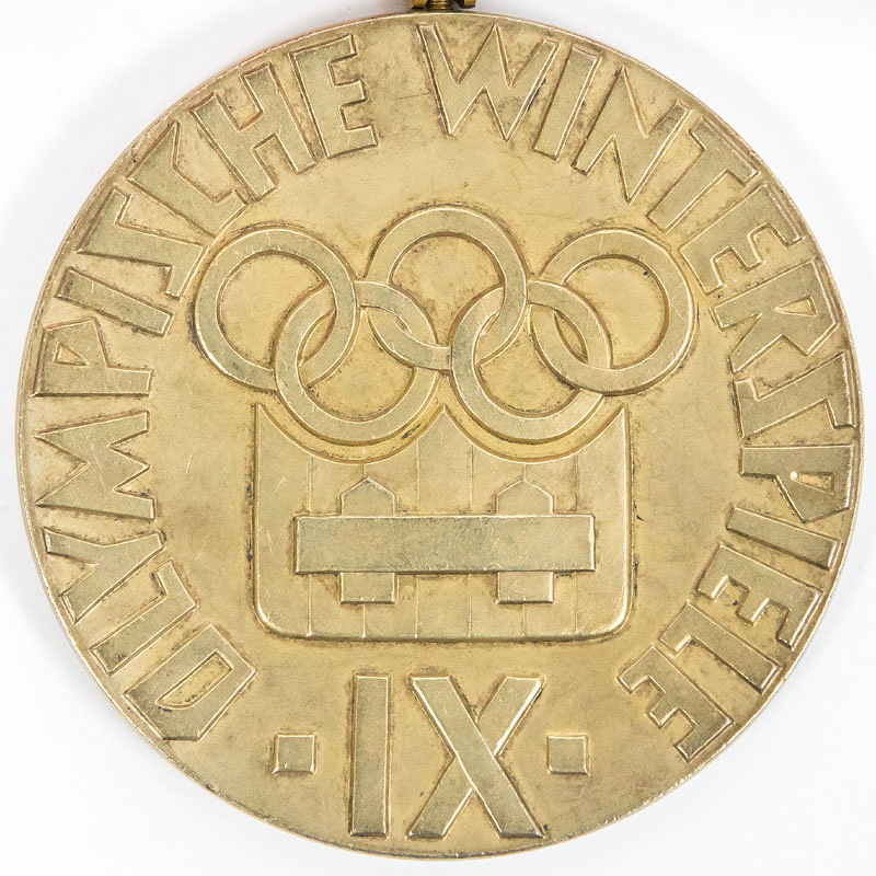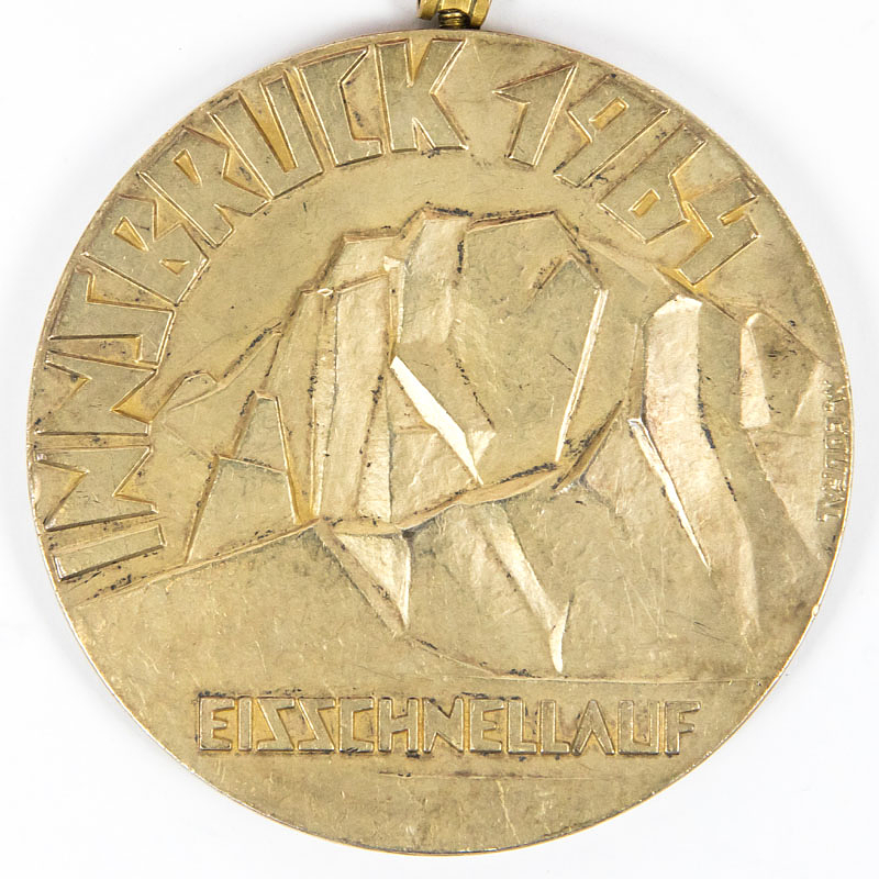 - Gold medal for first place in speed skating at the 1964 Innsbruck Winter Olympics. Design: M. Coufal. Gold-plated silver with pendant and silk ribbon. Weight: 168 grams, 7 cm. In original case. --Only 70 gold medals were awarded. --light signs of wear. The silk ribbon is stained and slightly damaged. This silk ribbon is not the original. The silk ribbon was lost and replaced with a similar one that matches the original. Condition: A-
