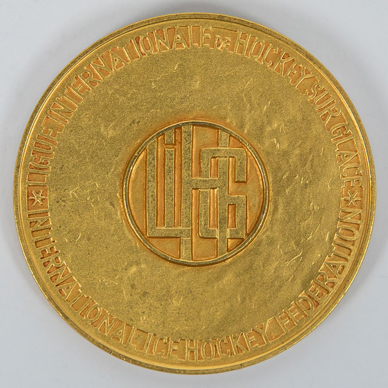 - Gold medal from the 1971 Ice Hockey World Championships with the inscription "Championnat du Monde. World Championship" and the engraving "1971." Awarded to the USSR players for the world championship title. Manufacturer: "Hugenin." Bronze, gold-plated, 6 cm --Approximately 35 medals were issued. Excellent (EF). -- From the collection of a former Swiss ice hockey club president, who collected these medals between approximately 1964 and 1980. Condition: A