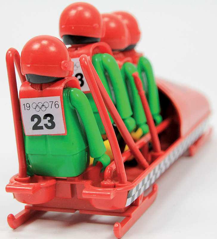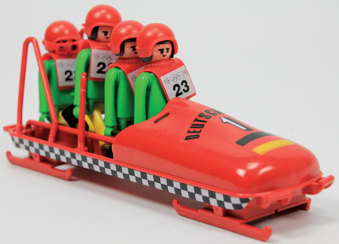 - Innsbruck Winter Olympics 1976. Playbig 4-man bobsleigh Germany. Four-man bobsleigh made of plastic with original "Germany 1" sticker (22 x 5.5 cm). Four movable figures with starting number "23". Olympic rings and year "1976". Height 9 cm each. Very rare!! Play-Big figures were only produced from 1975 to 1979. Unlike their competitor at the time, Playmobil, these figures have individually movable legs and feet! -- One skid is broken off at the front by about 2 cm. Otherwise in very good condition. Condition: B
