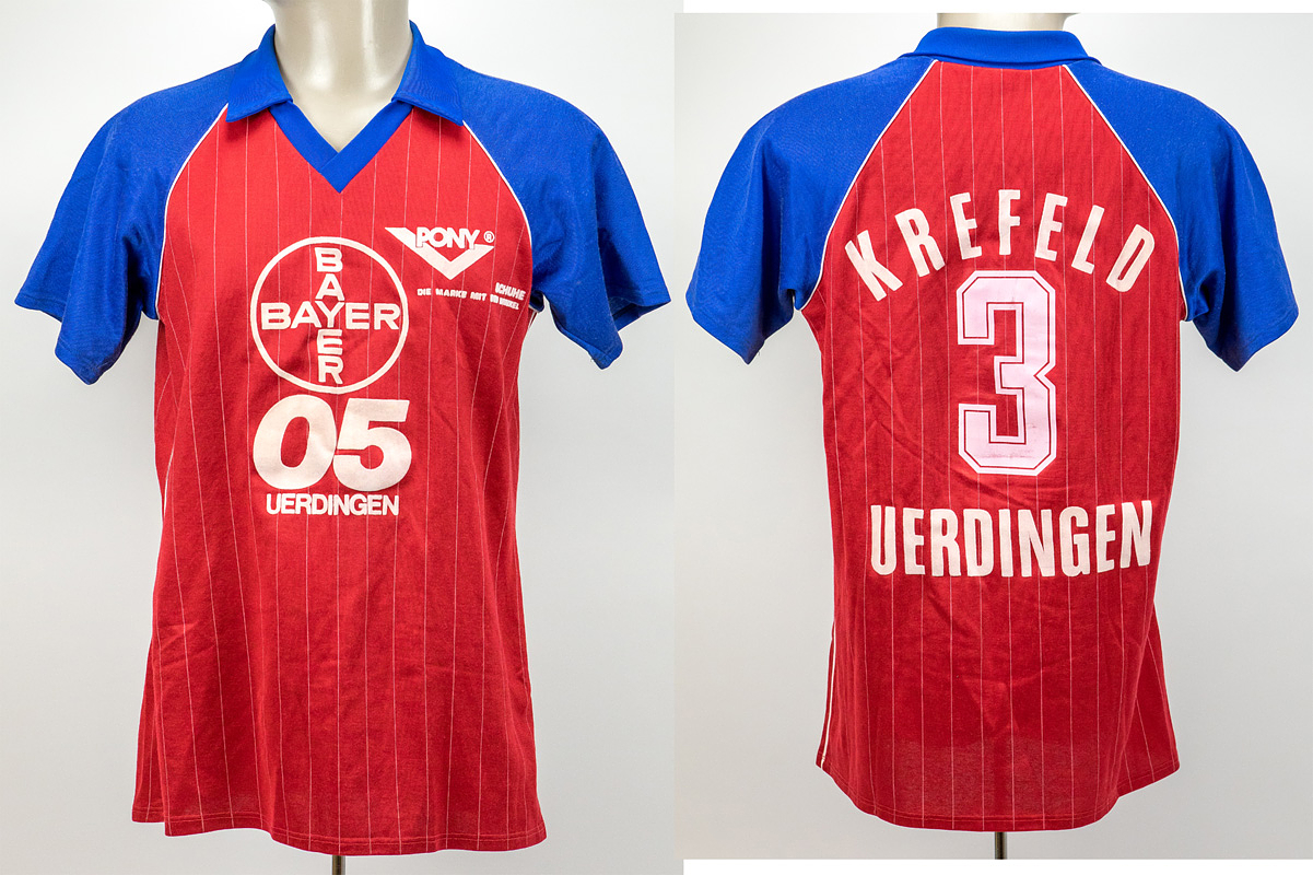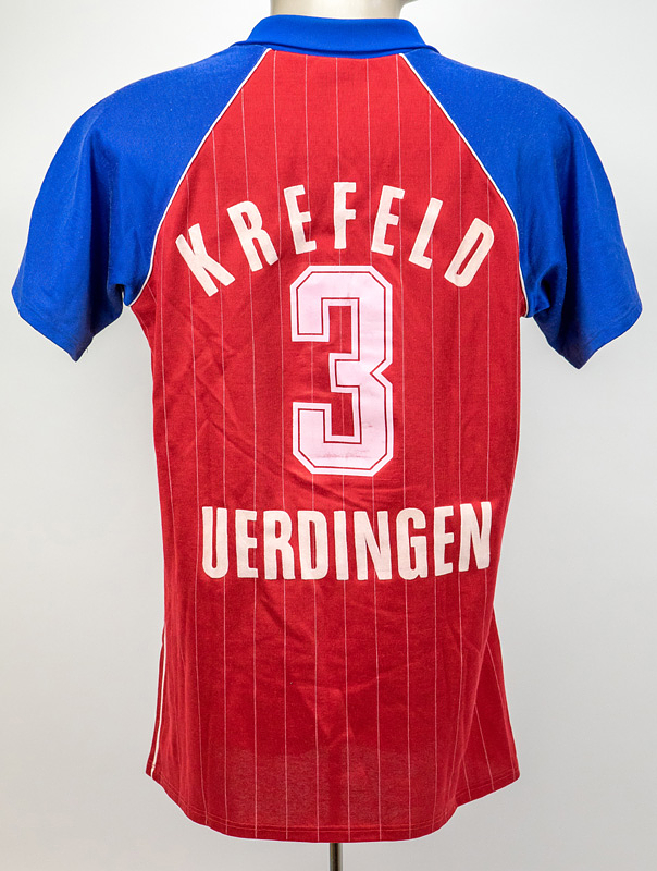 match worn football shirt Bayer Uerdingen 19984 - Original match worn shirt FC Bayer 05 Uerdingen with number 11. Worn in a bundesliga match between 1984 and 1987. Status: ACC. Long sleeved shirt; size 5/6; flocked club emblem; printed adidas emblem; gummed number and inscription "Krefeld Uerdingen". Shirt shows signs of usage (small stain on Bayer inscription); adidas. Condition: A-