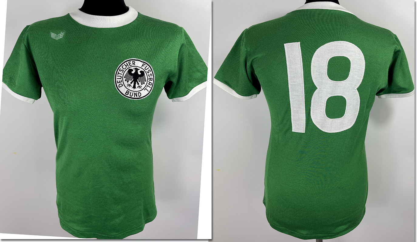 match worn football shirt germany 1977 - Original match-worn DFB player jersey with the number 18, worn by Rüdiger Abramczik. Worn during the 1977 South American tour. The jersey comes from the collection of a former DFB employee. Condition ABB.Short-sleeved jersey; size L; DFB crest sewn on; Erima manufacturer's logo rubberized, player number sewn on, 55% cotton, 45% polyester; Made in West Germany Condition: A