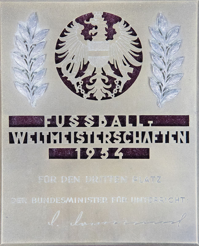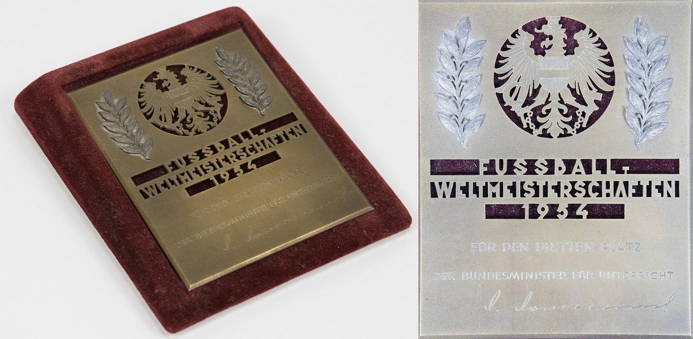 - Official commemorative plaque for the Austrian national team players who finished third at the 1954 FIFA World Cup. With the stamped inscription "1954 FIFA World Cup" and the engraving "For Third Place. The Federal Minister of Education." Bronze with two applied silver-plated laurel leaves, 11.3 x 9 cm. Includes original velvet-covered presentation tray for this plaque. --Only the national team players received them. Very rare! ---Origin: These piece comes from an old collection with a focus on the 1954 Football World Cup Condition: A-
