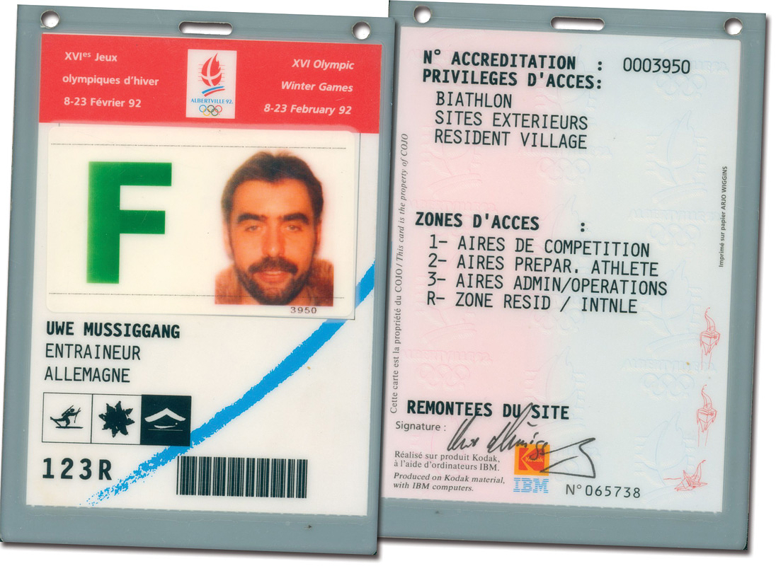 - Official Olympic ID card for the 1992 Albertville Winter Olympics, issued to Uwe Müssiggang (GER). Successful coach of the German national biathlon team from 1990 to 2014. Includes photograph and original signature. Plastic, 14 x 10 cm. Condition: A