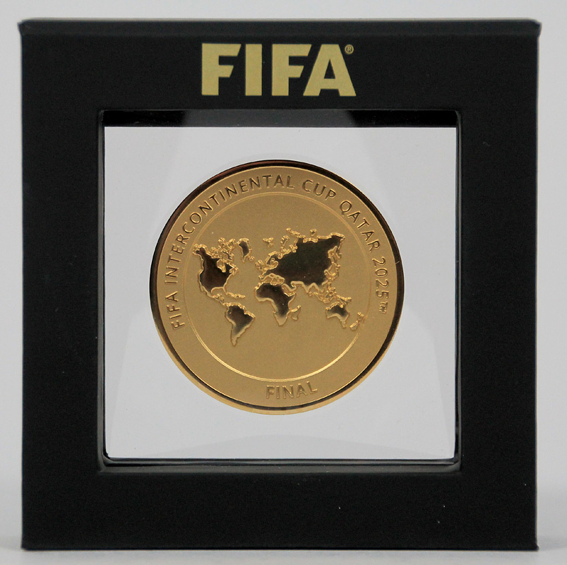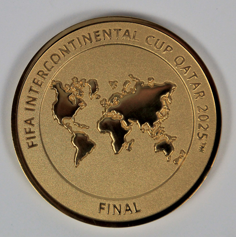 - Official participant medal "FIFA Intercontinental Cup Qatar 2025 FINAL". Tombac, gold-plated, 5 cm. In original box. --The players, coaches, and officials who participated in the final of the second edition of this competition in Doha received [something - likely a gift or award]. The 2025 winner was Paris Saint-Germain. Condition: A