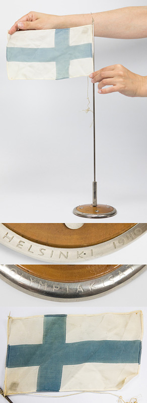 Olympic Games Heslinki 1940 Commemorativ flagpole - Miniature flagpole on a base with a Finnish flag made of linen (22 x 13 cm). The pole base has a silver-plated border engraved with "Helsinki 1940" and "Olympiakisat." The flagpole's base is chrome-plated. Height: 50 cm. --Very rare and decorative souvenir of the cancelled 1940 Olympic Games in Helsinki. Condition: B