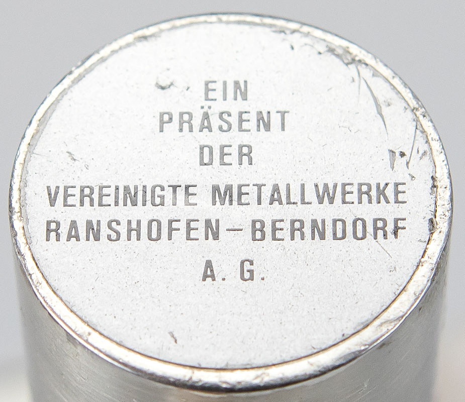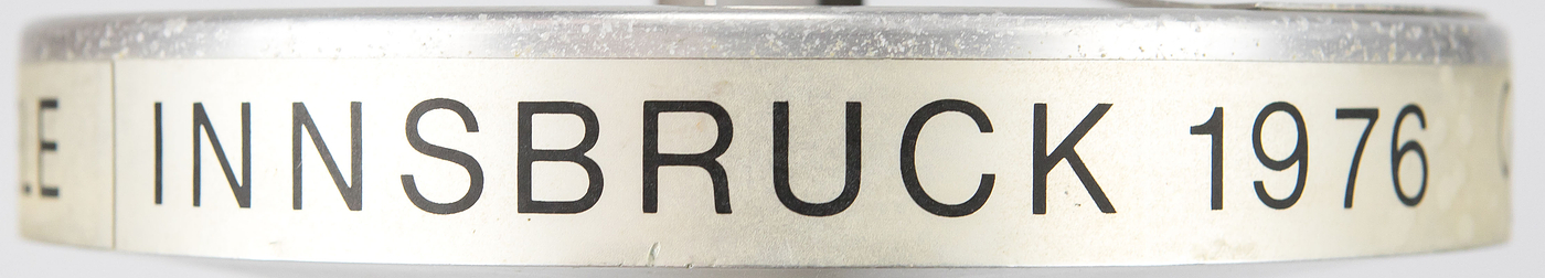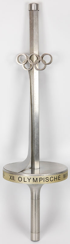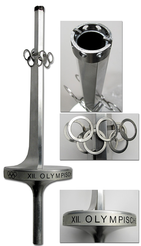 Olympic Games Innsbruck 1976. Official Torch - Original torch from the Olympic relay from Olympia to Innsbruck 1976. Stainless steel and aluminium, manufactured by United Metalworks, Ranshofen-Berndorf AG. Length 74 cm, plate diameter 21 cm. This torch is very rare and one of less than 100 copies. --This torch was used in the torch relay for the 1976 Winter Olympics in Vorarlberg. The torch comes from the estate of a high-ranking administrative official from Vorarlberg who worked for sports in this Austrian province from 1967 to 1984. He received this torch as a gift from the manufacturer after the torch relay. The torch has two special features: 1) A plaque bearing the inscription "Ein Geschenk der Vereinigte Metallwerke Ranshofen-Berndorf A.G." was affixed to the handle of the torch by the manufacturer. 2) The manufacturer sealed the torch tip with a screw-on capsule to prevent dirt from accumulating inside the torch. The torch's outlet nozzle was attached to this metal capsule. ---The torch has light speckles of corrosion. Condition: A-