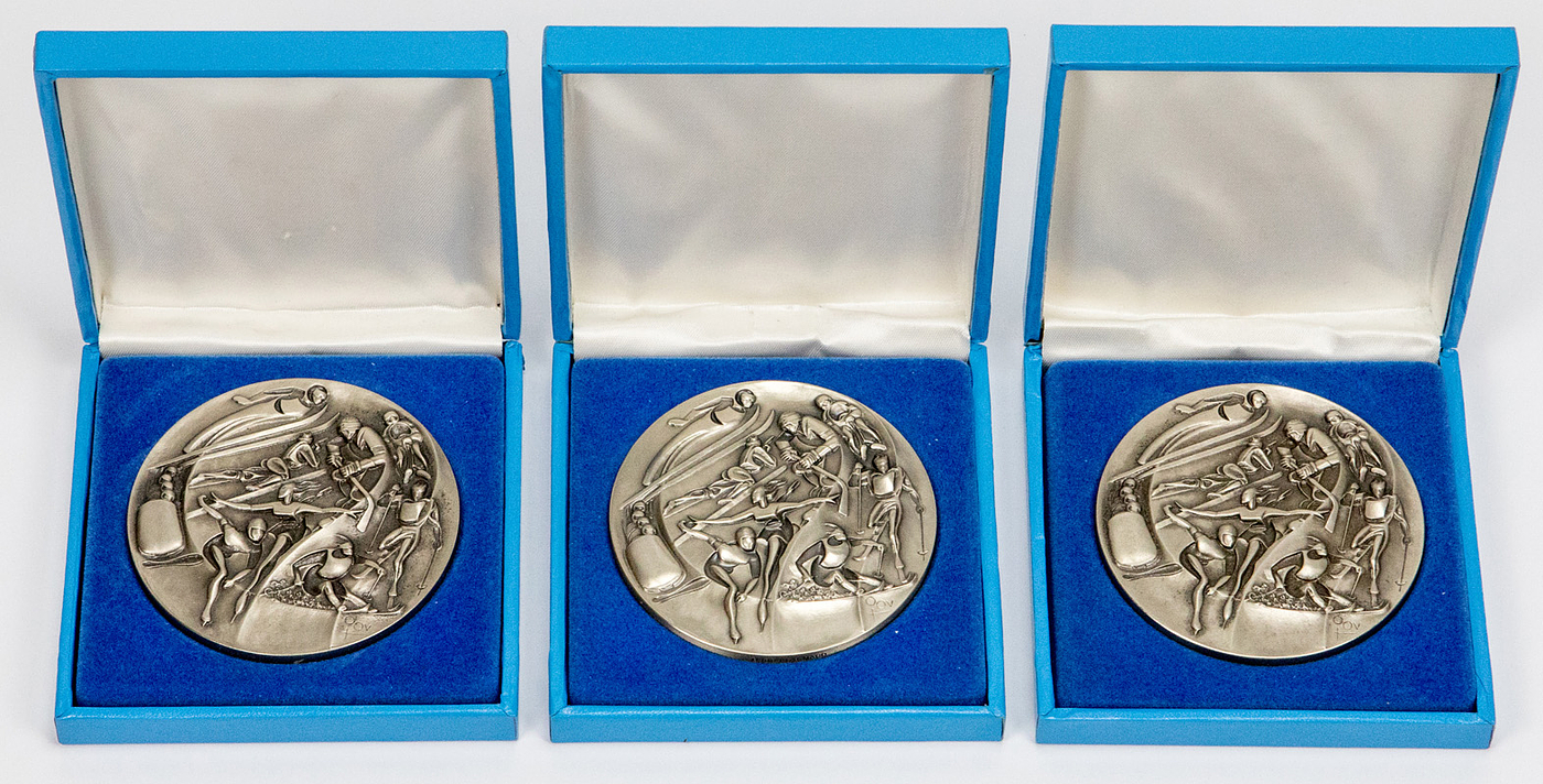 - Olympic Games Lake Placid 1980. 3x Participation medal for athletes at the Winter Games. Nickel-Silver, hallmarked "IOC 1978 MACO". Size 7.6 cm in original case Condition: A