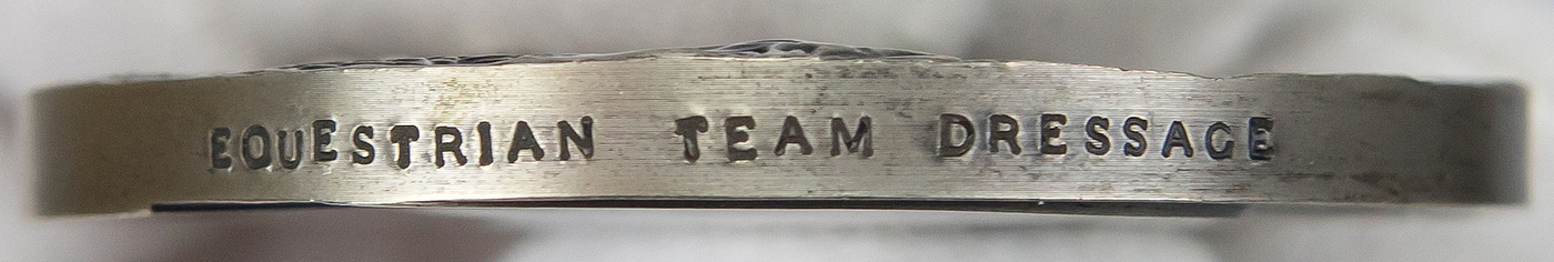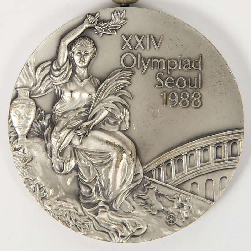 Olympic Games Seoul 1988. Silver Winner medal - Olympic Games Seoul 1988. Silver Winner medal: Original winner's medal from the 1988 Seoul Olympic Games for second place in the equestrian dressage team for Switzerland. Engraved with "Equestrian Team Dressage" on the edge. Silver, 6 cm (weight 140), with original silk ribbon. --The consignor received this medal directly from the Swiss athlete. The buyer will receive the athlete's name. Condition: A