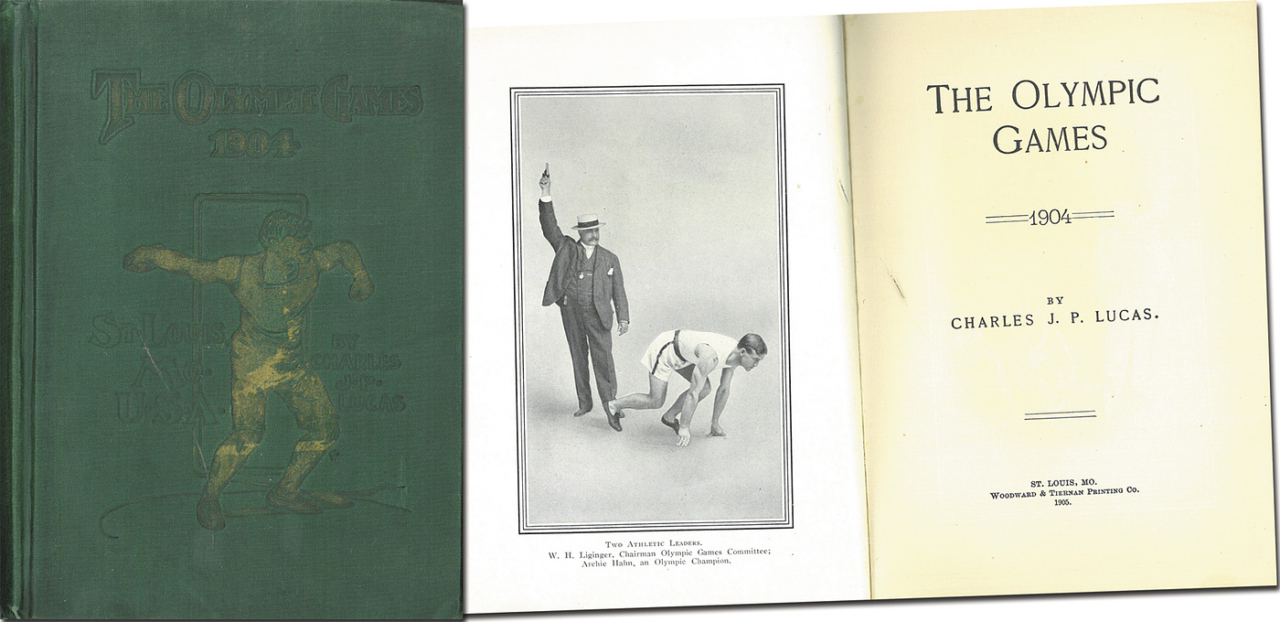 Olympic Games St.Louis 1904 Lucas Official Report - The Olympic Games 1904. (Official Report). 148 pages + 28 full-page B/W photos, 18.5x13.2 cm, gold-embossed linen cover, Woodward, St. Louis 1905. --One of the rarest official reports on the Olympic Games. Chapters about marathons, records, the Dewitt case and handicap competitions, among other things. (ENGLISH) -Pages 133 to 148 top right with slightly waterstained. Gold stamping mostly peeled off Condition: C
