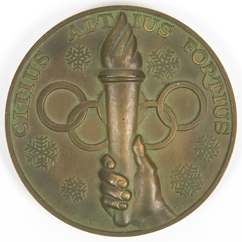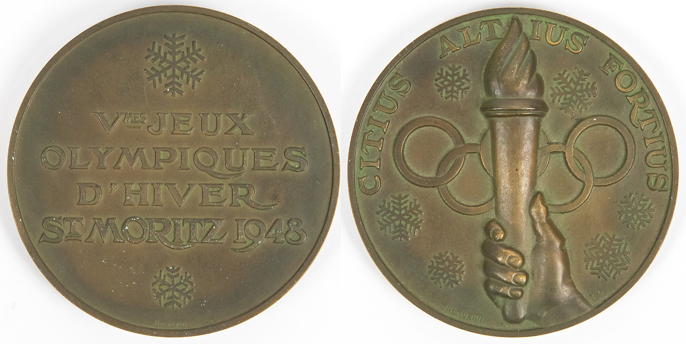 - Olympic Winter Games 1948 Bronze winner medal: Bronze medal fot the third place at the Olympic Winter Games in St. Moritz 1948 with inscription „Vmes Jeux Olympiques d'hiver St.Moritz 1948". Bronze, made by Hugueni, 6 cm. There were only 46 bronze medals at the Olympic Games of 1948. Condition: A