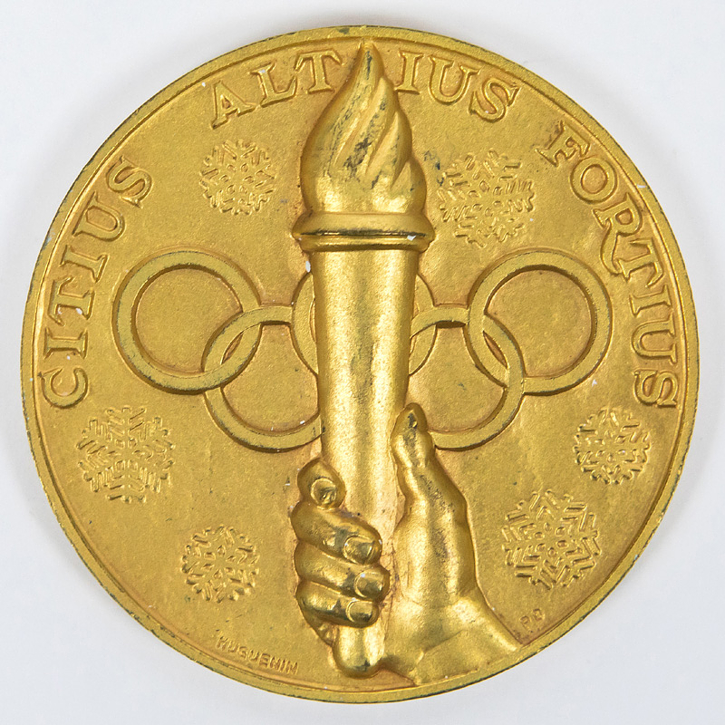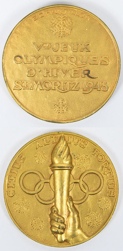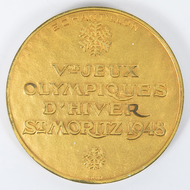 - Olympic Winter Games 1948 Gold Winner medal: Winner's medal for first place at the 1948 St. Moritz Winter Olympics. "Vmy Olympic Winter Games St. Moritz 1948." Gold-plated silver (hallmarked, 925 silver, weight: 100 grams). Manufacturer: Huguenin, 6 cm. Engraved with ""Echantillon" (Sample). --This is Sample from the Huguenin company, presented to the IOC/OC for testing in 1947/48. After the IOC/OC approved this Sample, the medal minting began. This Sample coin is identical to the winner's medals down to the smallest detail and weight. It has similar pieces for the silver and bronze medals, engraved with "Echantillon." There is some minor gold wear along the edges. 41 gold medals were issued! Condition: A-