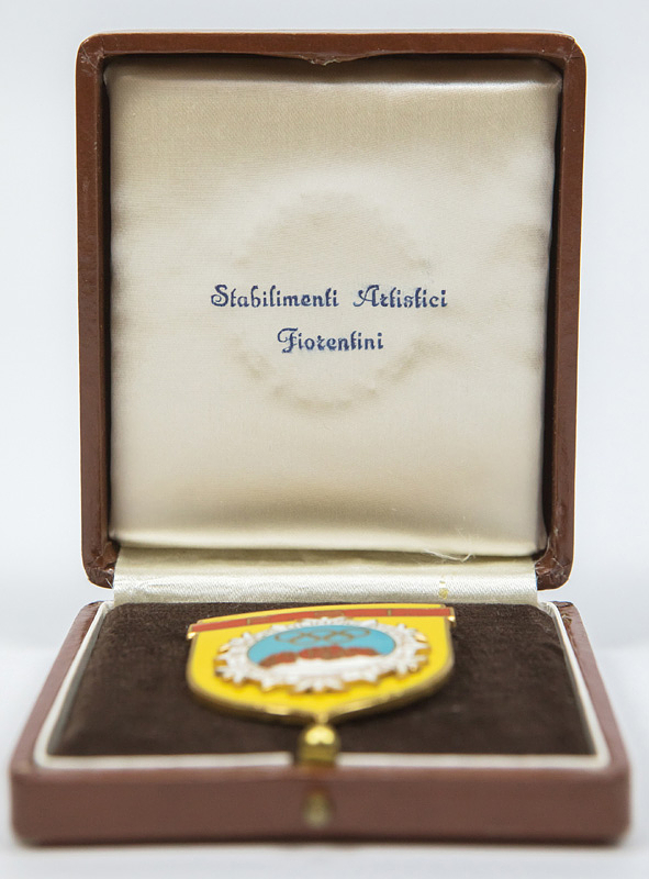 Olympic Winter Games 1956. Participation badge - 1956 Winter Olympics Cortina d'Ampezzo. Official participant badge with the inscription "FSI" (International Federation). Bronze, gold-plated, color enameled, 5 x 4 cm. In original leather box with the Olympic rings and the year "1956" (9 x 8 x 2.2 cm). --(Ebel 1956-W-004). Only 21 badges were issued! Condition: A