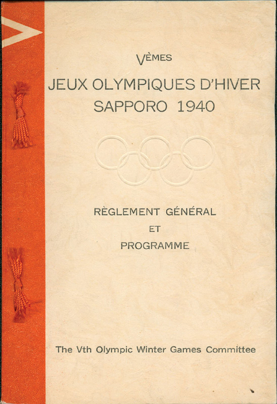 Olympic Wintergames Sapporo 1940 Programm - Vémes Jeux Olympiques d´hiver Sapporo 1940. Regulations Géneral et Programme. 50 pages and 3 folding plans. 18.5x12.5 cm cardboard. Sapporo The Vth Olympic Winter Games Committee (1938) -Official regulations of the Sapporo 1940 Winter Olympics and complete program in French. With original silk bows for the book block. Due to the Sino-Japanese War in 1938, Sapporo returned the Winter Games on July 16, 1938. The Sapporo regulations, which were produced shortly before the return of the Games in 1938, were therefore not circulated! Absolute rarity!!! Condition: A-