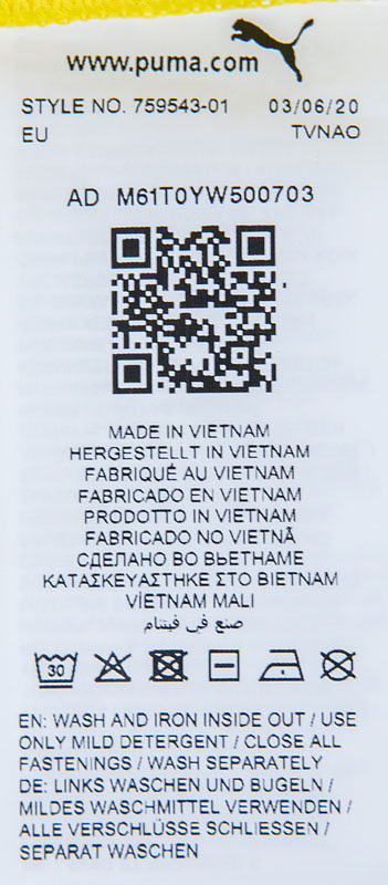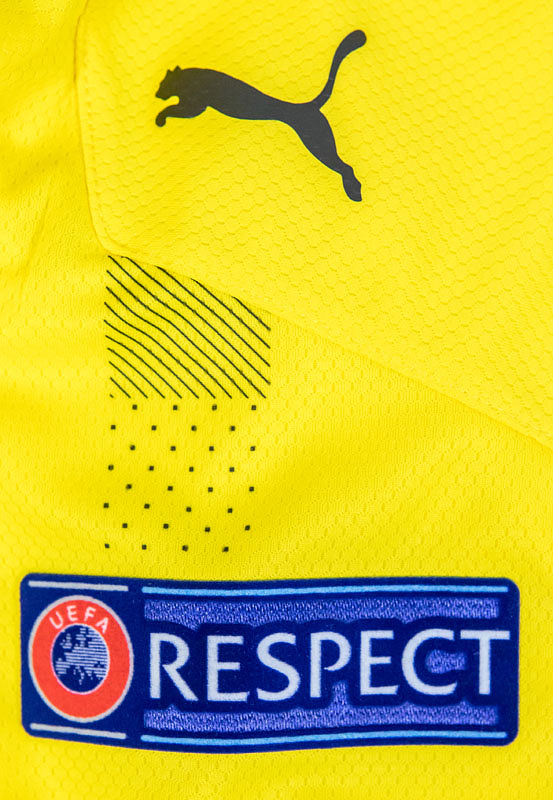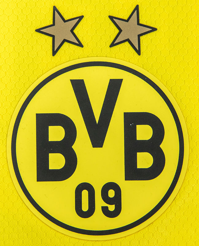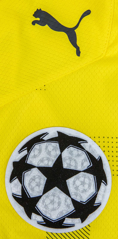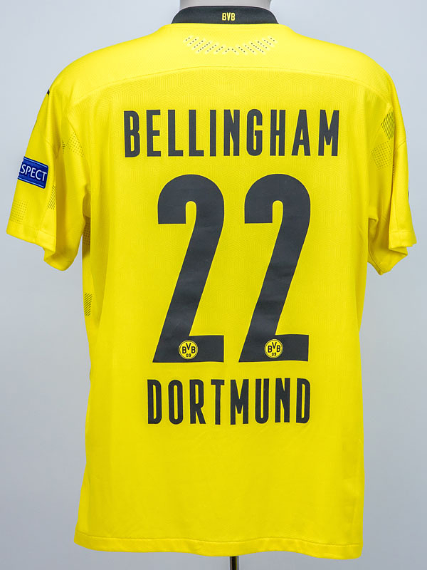 - Original match-issued Borussia Dortmund number 22 jersey. Designed for Jude Bellingham in UEFA Champions League matches during the 2020/2021 season. Bellingham was not used and is a 38-time England capper. Status: ABC --Short-sleeved jersey with button placket; size L; rubberized club logo, two Champions League stars, and Puma logos; rubberized 'evonik' advertising print; rubberized back number, player name, and 'Dortmund' lettering; laser-engraved ventilation holes; 'BVB' lettering embroidered on the back of the collar; with Champions League Starball patch and UEFA Respect patch; Puma DryCell. Condition: A