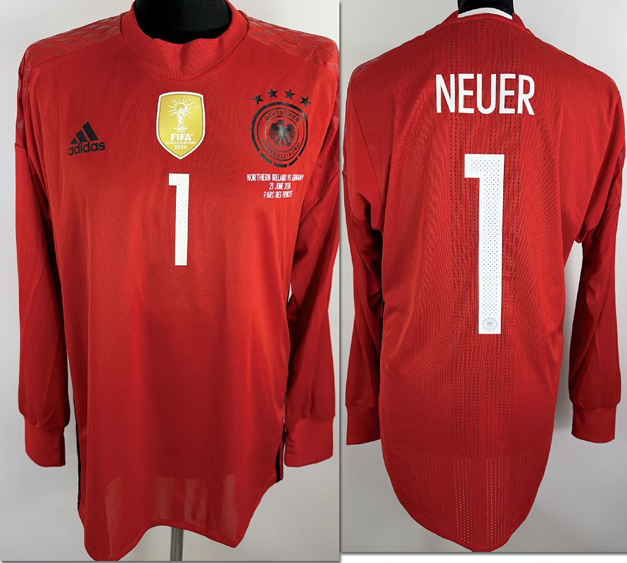 - Original match-issued DFB player jersey with the number 1, Manuel Neuer. Prepared for the European Championship match against Northern Ireland on June 21, 2016, in Paris. Jersey comes from the collection of a former German FA employee. StatusAAB member. Long-sleeved jersey; size 8; DFB logo, rubberized Adidas logo, match details, rubberized player number and name; flocked European Championship patch and Respect patch; Adidas Adizero; 100% polyester; Made in Vietnam; Condition: A
