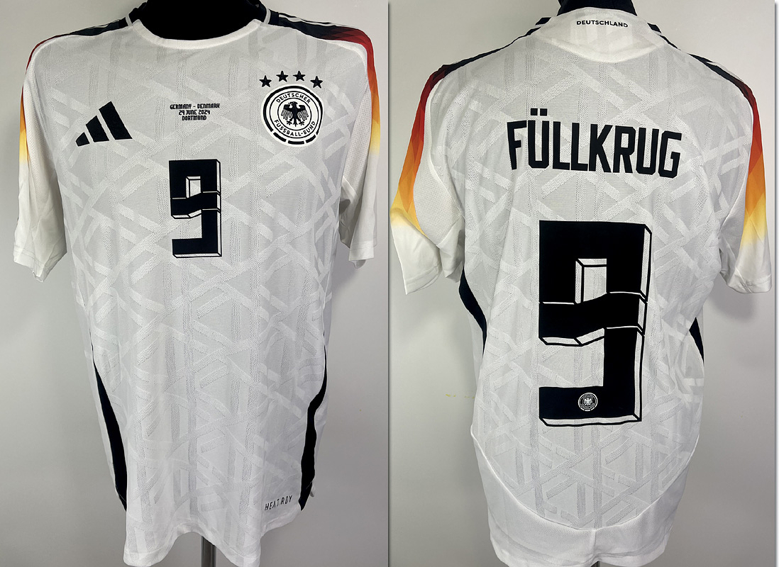 - Original match-issued DFB player jersey with the number 9, worn by Niklas Füllkrug. Prepared for the UEFA Euro 2024 match against Denmark on June 29, 2024, in Dortmund. The jersey comes from the collection of a former DFB employee. Status: AAB Short-sleeved jersey; size L; DFB logo, rubberized Adidas logo, match details, rubberized player number and name; flocked European Championship patch and Foundation patch; Adidas HEAT.RDY; 100% polyester; Made in Vietnam; Condition: A-