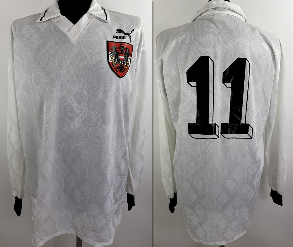 - Original match-worn Austrian player shirt with the number 11, worn by Andreas Herzog. Worn in the international match against Germany on November 18, 1992, in Nuremberg. Condition: AAB. The teams wore black armbands in honor of Ernst Happel, who died on November 14, 1982. Long-sleeved shirt; size XL; national team emblem sewn on, Puma manufacturer's logo applied; player number rubberized; 100% polyester; Made in Germany; The jersey comes from the collection of a former DFB official. Condition: A-
