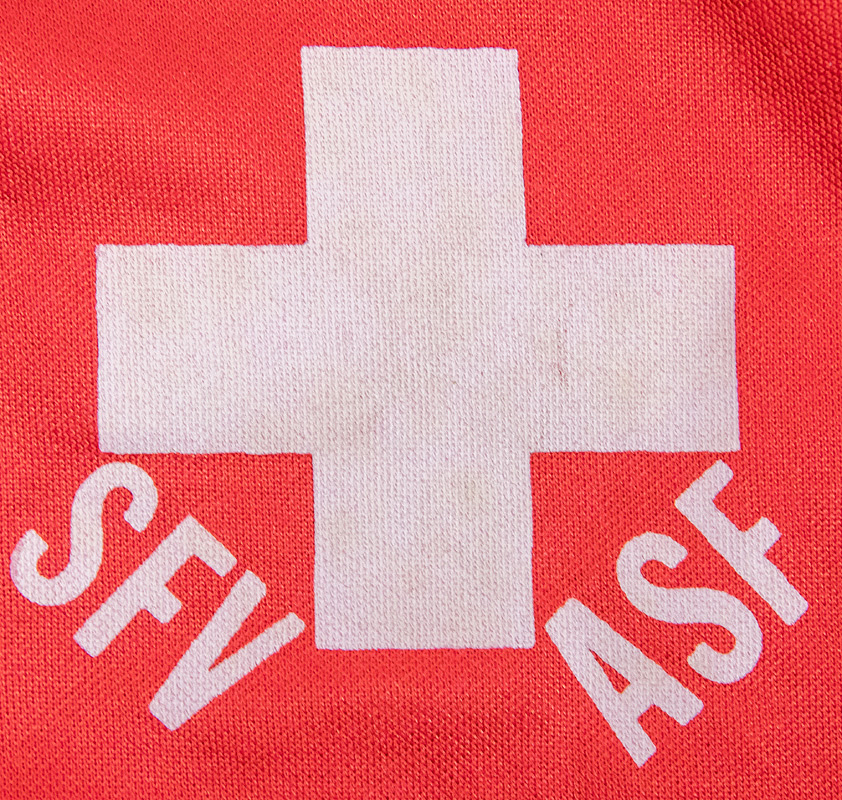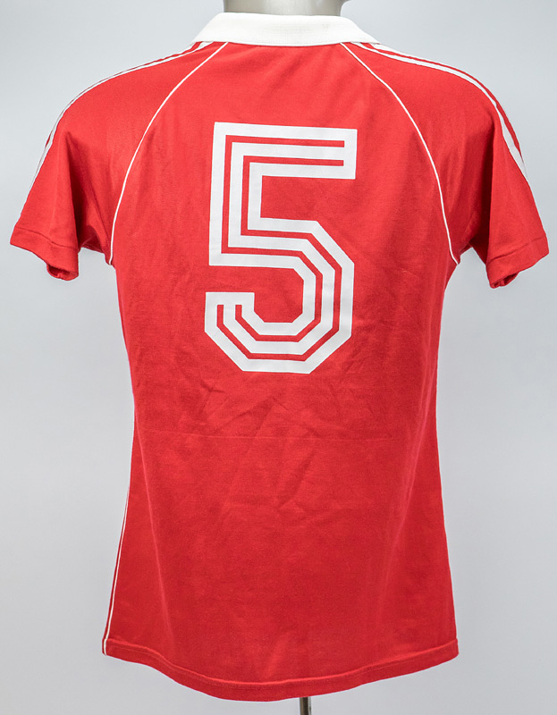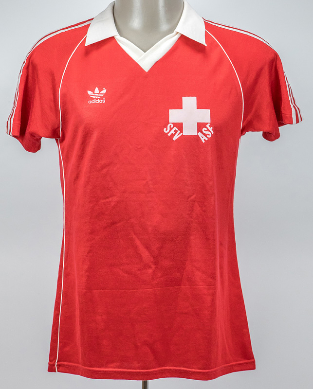 - Original match worn / isseud shirt Switzerland with number 5. Worn in a friendly match for the Swiss team between 1980 and 1982. Status: ACC. Short sleeved; size M=5/6; gumemd FA emblem, printed adidas emblem, gummed number; adidas. Condition: A-