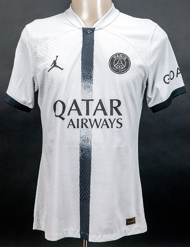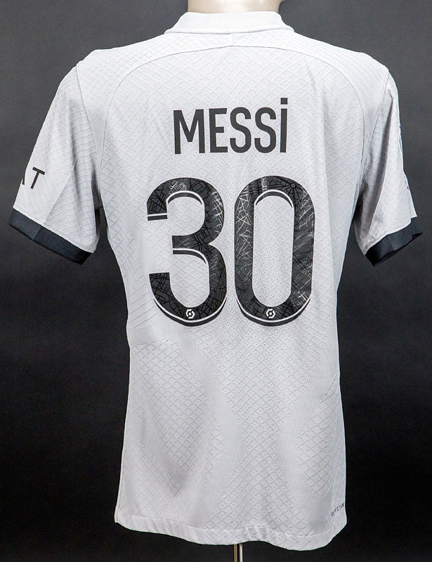 - Original match-worn/issued shirt from Paris Saint-Germain (PSG) with the number 30. Worn by Lionel Messi in a French Ligue 1 match during the 2022/2023 season. Messi is the 2022 FIFA World Cup winner with Argentina. Special Michael Jordan jersey. Status: ABC --Short-sleeved jersey with button placket; size M; rubberized club emblem and Michael Jordan logo; rubberized 'Qatar Airways' advertising print; rubberized back number and player name; with Ligue 1 Uber Eats 2022 Champion patch and Goat patch; Nike Dri-Fit ADV. Condition: A