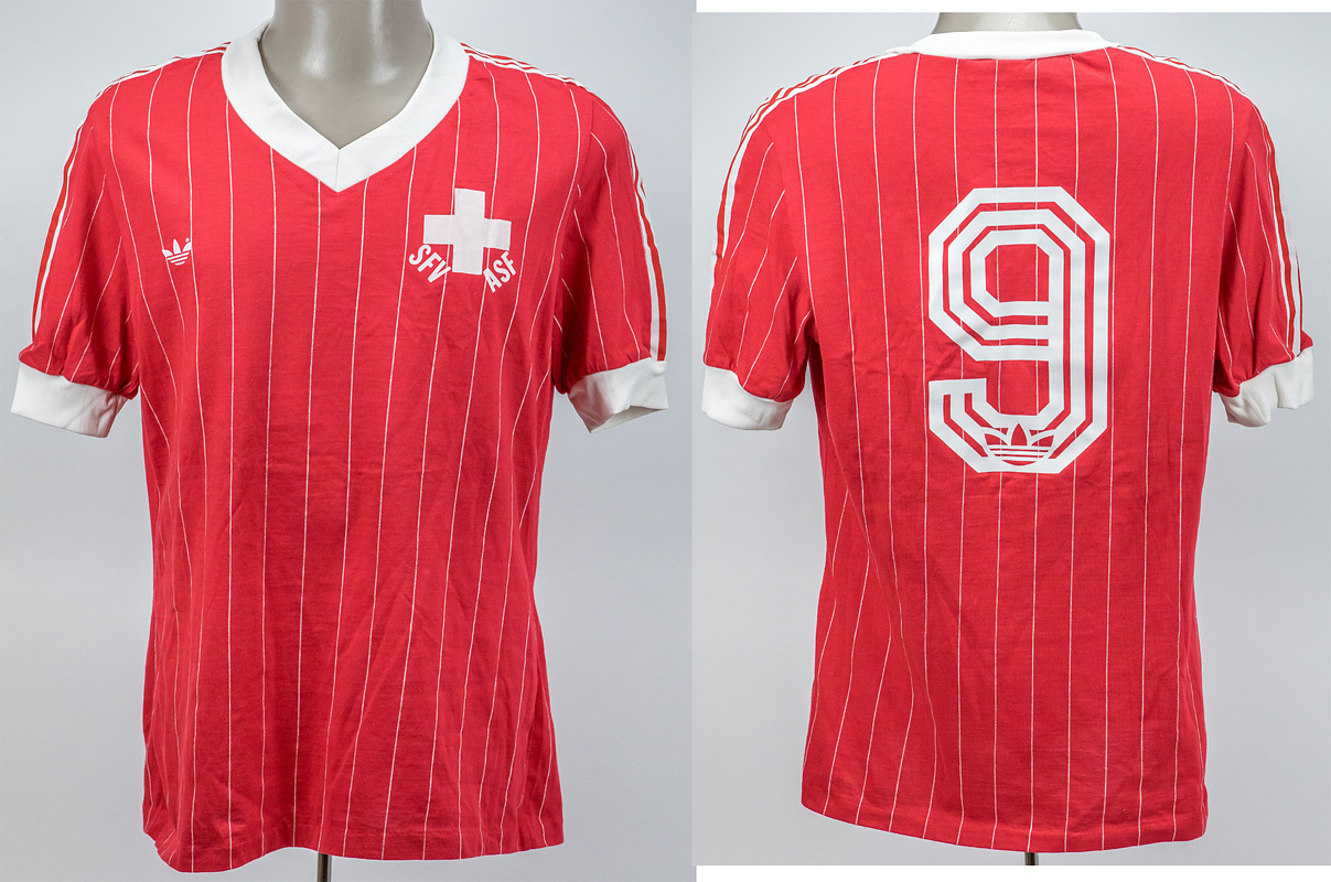 - Original match-worn Swiss player shirt with the number 9. Presumably worn in the friendly match on May 26, 1984, Switzerland vs. Spain (0:4). Condition: AAA. --Short-sleeved jersey; rubberized federation logo; printed adidas logo; rubberized back number; adidas. The consignor obtained this jersey from the collection of Swiss national player Jean-Paul Brigger, who wore number 9 in this match. Condition: A-