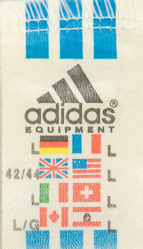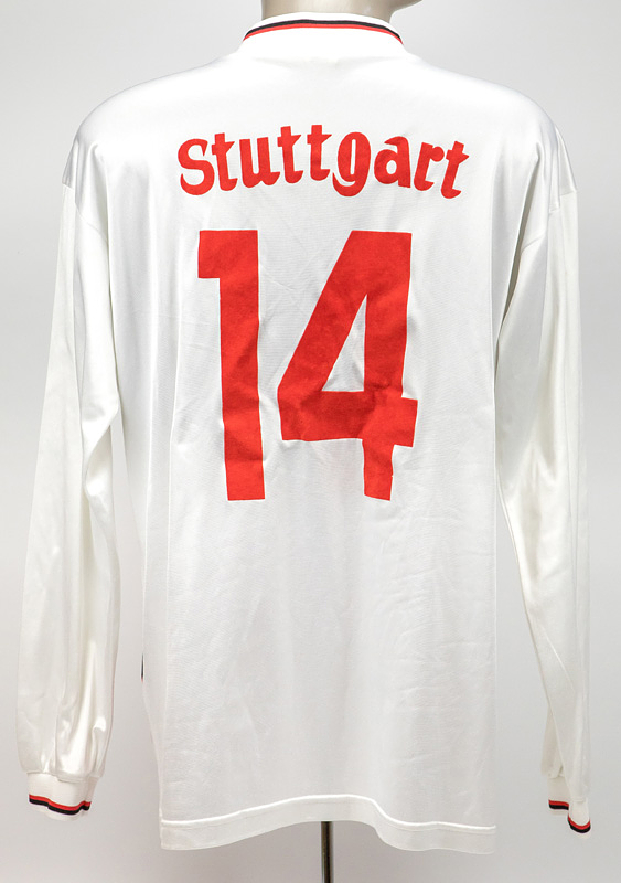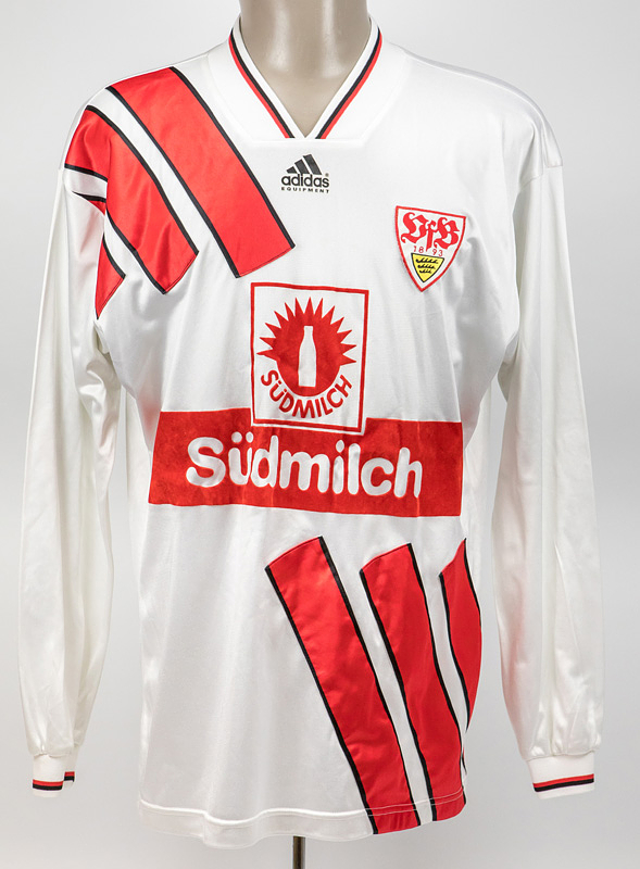 - Original match-worn VfB Stuttgart playershirt with the number 14. Worn by Thomas Scheider in matches of the 1993/94 Bundesliga season. Sponsor: Südmilch. Status: ABA. -Long-sleeved jersey; size L. Embroidered club emblem sewn on; back number and club name thinly flocked; sponsor logo flocked on. Adidas logo thinly foiled on; manufacturer: Adidas Equipment. The jersey comes directly from the collection of a former high-ranking VfB Stuttgart official who received this jersey from Thomas Schneider immediately after a match in the 1993/94 season. Condition: B