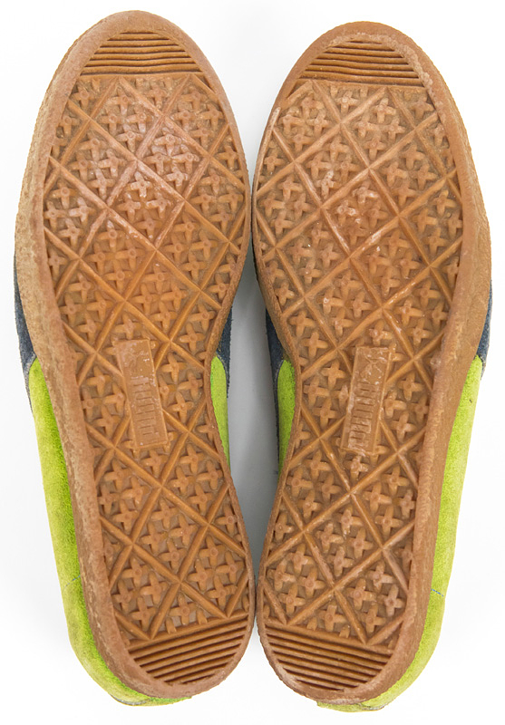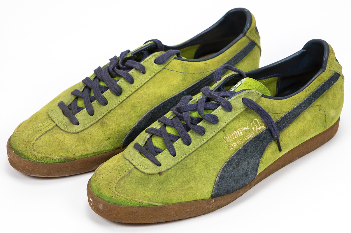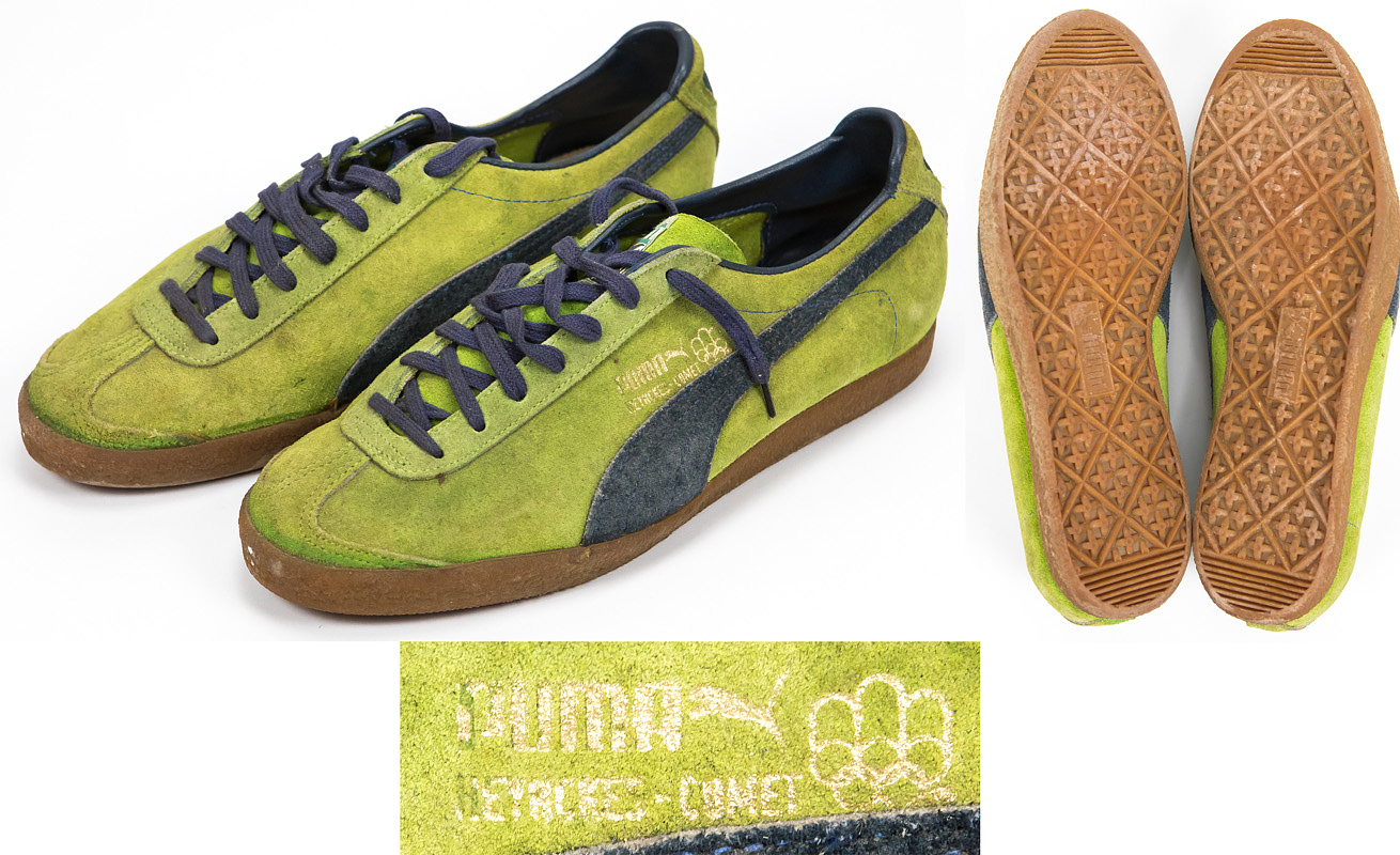 - Original Puma football boots for hard surfaces, worn by Werner Weist during training for Werder Bremen in 1976. "Puma Heynckes Comet," size 8. Suede upper, synthetic sole. With the logo of the 1976 Montreal Summer Olympics. Status: ACA --The football boots come directly from the collection of Werner Weist (1949-2019) - Borussia Dortmund 1968-1971 (72/34), Werder Bremen 1971-1977 (145/33), Stuttgarter Kickers (1977-1978; 10/1); 3x DFB U-23 1970 + 1971). The buyer receives a certificate of authenticity and confirmation from the Weist family regarding the provenance of the items. Condition: A-