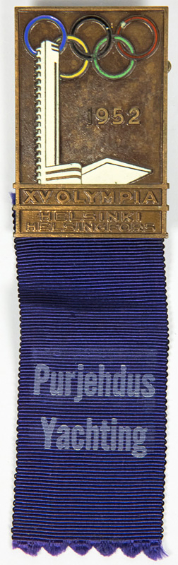 - Participation badge Olympic Games 1952 Heslinki „Purjehdus Yachting Technicien" (Sailing) with blue silk ribbon. Bronze, multicouloured enameled. --Small chips on the Olympic rings Condition: A-