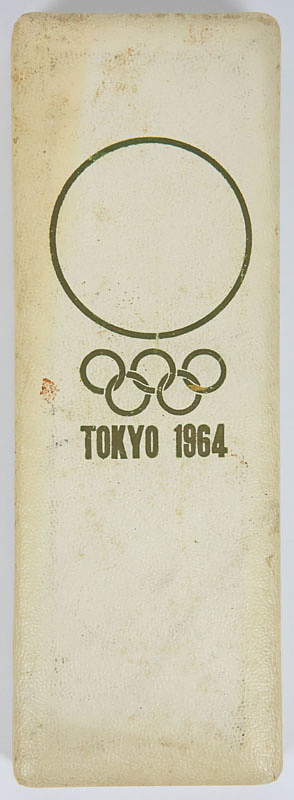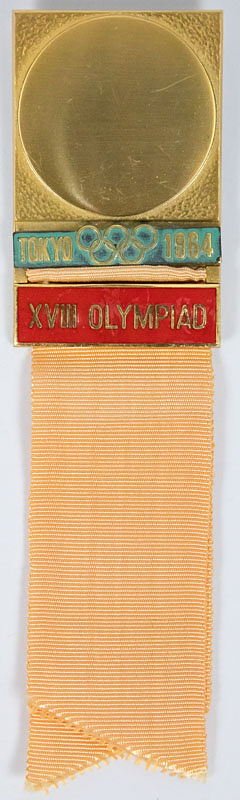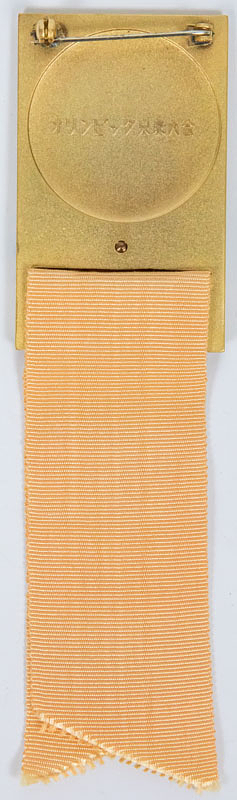 Participation Badge: Olympic Games 1964. - Official participation badge Tokyo 1964 "XVIII Olympiad". For Speial delegates. Bronze, gold plated with sandcoloured silk ribbon. 14x3.8 cm. Badge for Special Delegates. Ebel 1964-S-020. Rare item in original box. Condition badge: A. Condition box: B-C. Box shopworn. Condition: