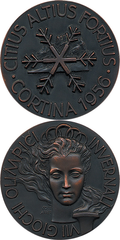 Participation Medal: Olmypic Winter Games 1956. - Official Medal for athletes in Cortina d'Ampezzo 1956. Attractive bronze cast, size 4.5cm. EF. Condition: A
