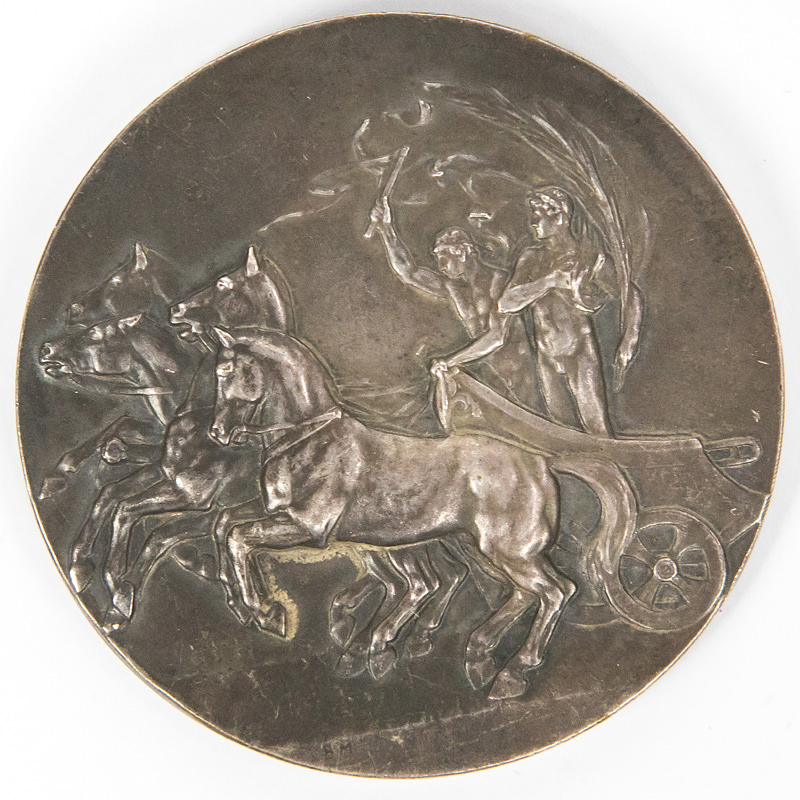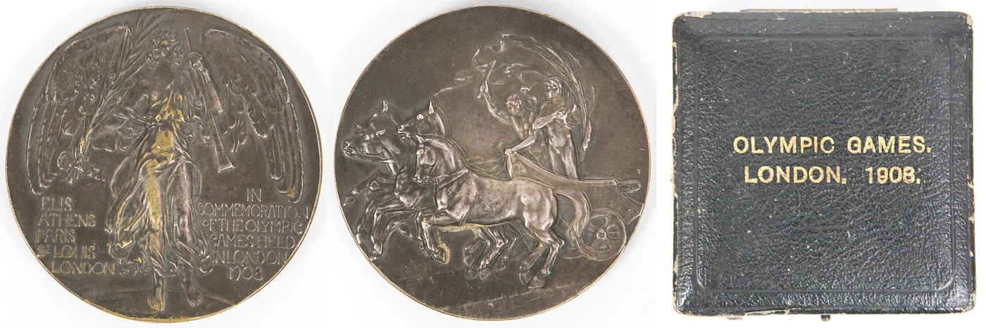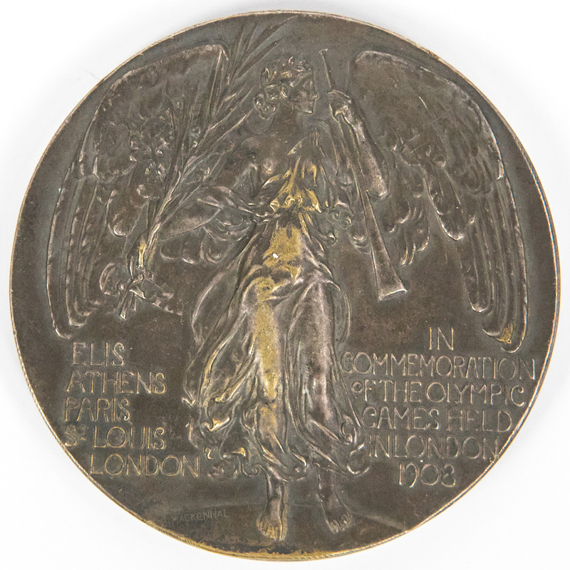 - Participation Medal: Olympic Games 1908: Silvered Medal: „In Commemoration of the Olympic Games held in London 1908“. Designed by B.MacKannal. Bronze, silver plated (62 Gramm), 5 cm.Very rare! In original box inscribed "Olympic Games London 1908". Medal arnished (condition: A), box (condition: B) Condition:
