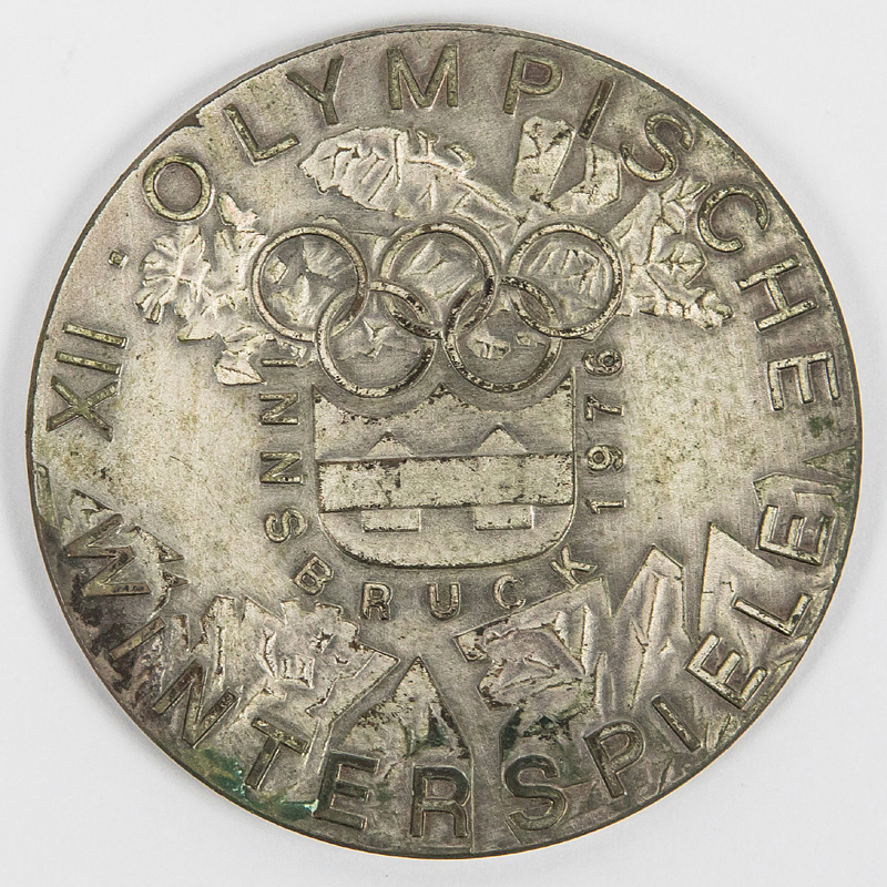 Participation Medal: Olympic Games Innsbruck 1976 - Silver plated bronze. In original presentation box. With corrosion as usual. 5 cm. Condition: B
